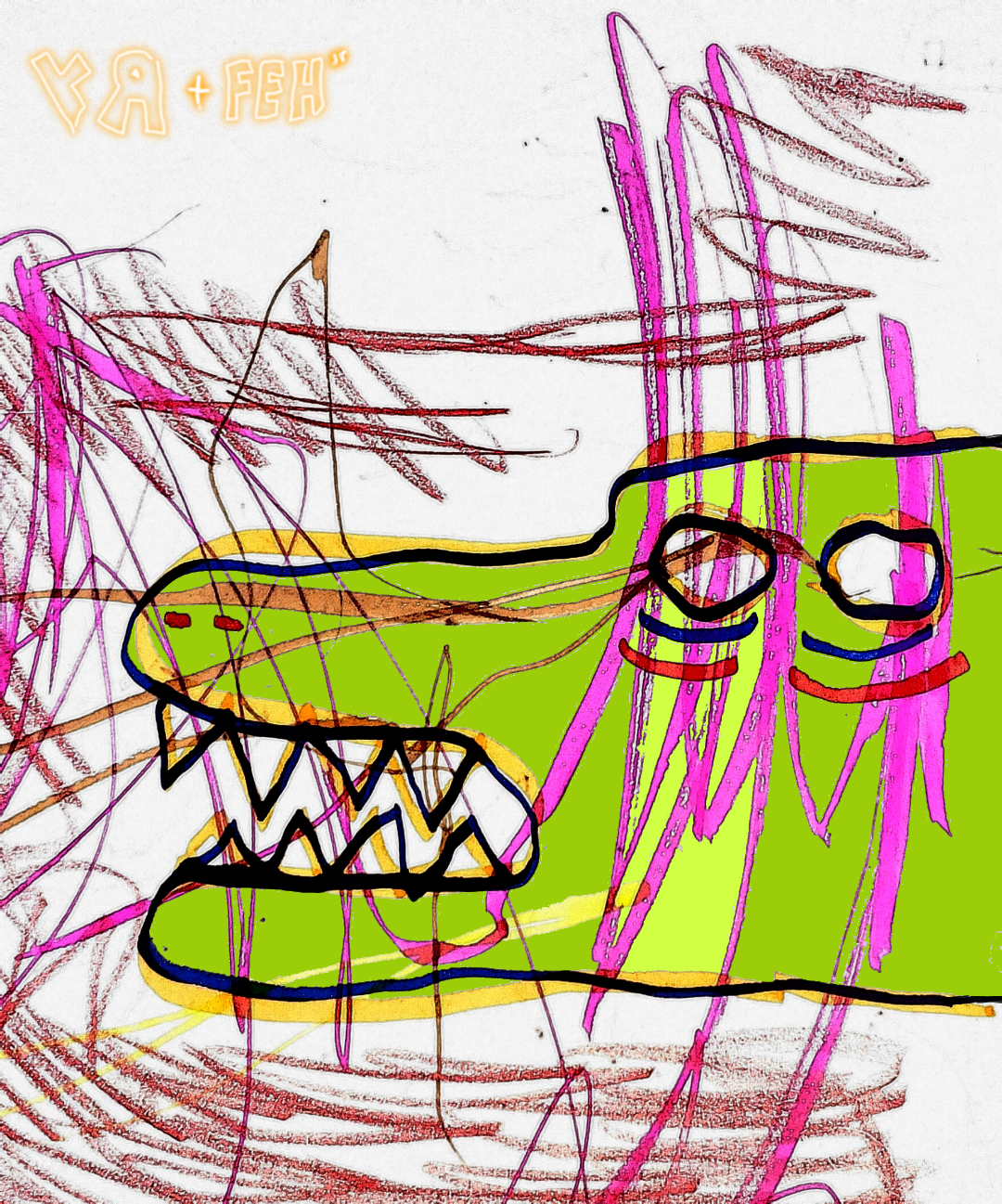 This piece is another collaboration between me and my year and a half old granddaughter, Felicity. I honestly love the wild, fully physical lines that she adds to these types of works---plus, the gator ain't bad. It's not an NFT+, so you're only getting the NFT---nothing physical---but that's probably okay. Easier to transport a digital work than a giant, two foot by three foot chunk of paper!