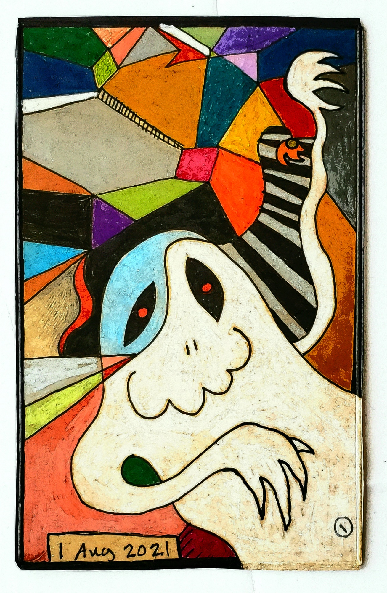 This is the HAND COLORED version of "Ghost of Cubism." I prefer the roughness of this version, even though the colors on the digitally colored version are so vivid. The ghost is also happier with this version because he isn't a fan of saturated colors. What do YOU think???