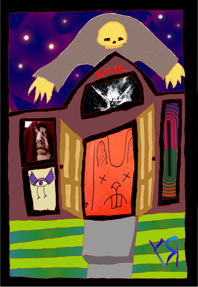 [The "house" is Sharpie on reclaimed cardboard with digital embellishments and color. The WINDOWS are multi-media projected psychic phantasms(t)(c)!]
