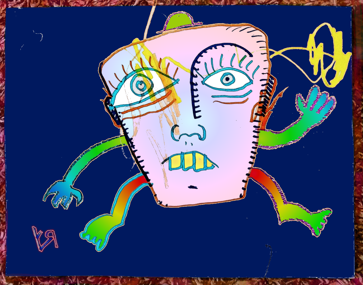 [Felt pen and crayon on paper with digital embellishments and color.] He wasn't much good at "pumping iron," but Henley read a lot... I mean, A LOT! He read so much that his brain began to grow...and grow...and GROW! His body was absorbed by his cranium until... (Who knows what happened next???)