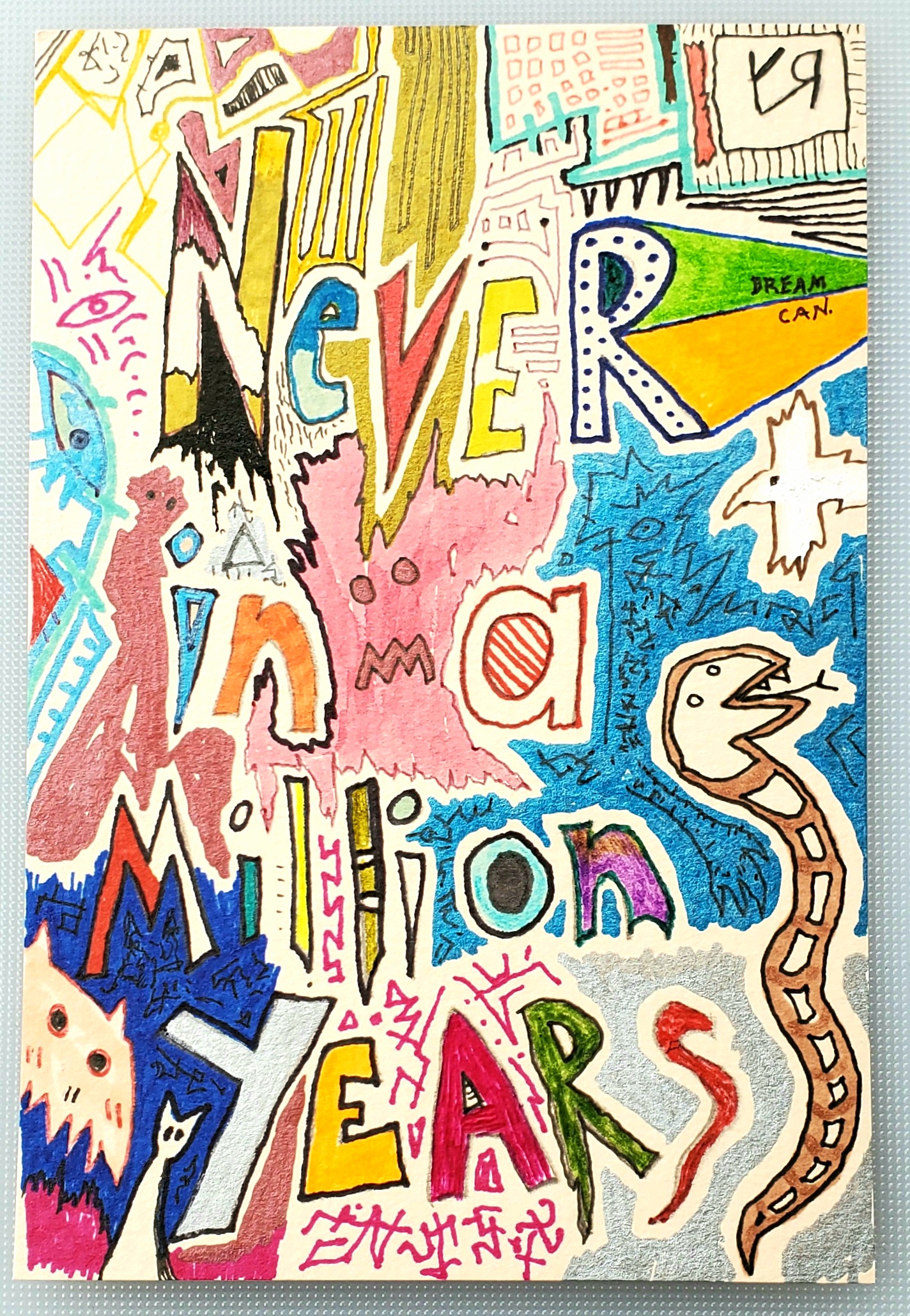 The phrase just popped into my head. The lines and colors are all free-association, on the spot, what went through my skull as I was sitting in a parking lot waiting for my wife and daughter to finish shopping. End of the day, I like it! AND, this is an NFT+, meaning that I will mail the original drawing, for no extra charge, to the first person to buy this NFT! Worldwide! (I hope it doesn't curse whoever buys it!)