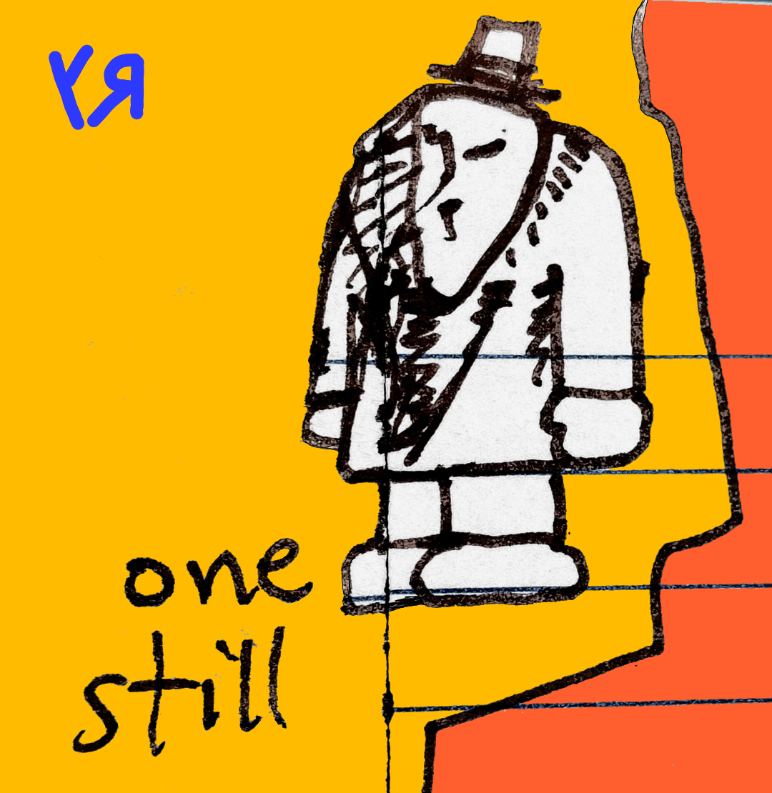[Liner pen on notebook page with digital embellishments and color.] To ME, this drawings looks like the cover of a 1960's humorous crime novel---maybe something in the Pink Panther vein... Could be the colors, or the sketchiness of the "detective." I'm not sure---but I like it! ---Richard F. Yates (Holy Fool)