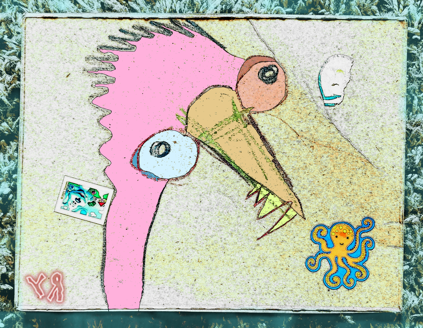 [Crayon, colored pencil, and stickers on reclaimed cardboard with digital embellishments and color.]