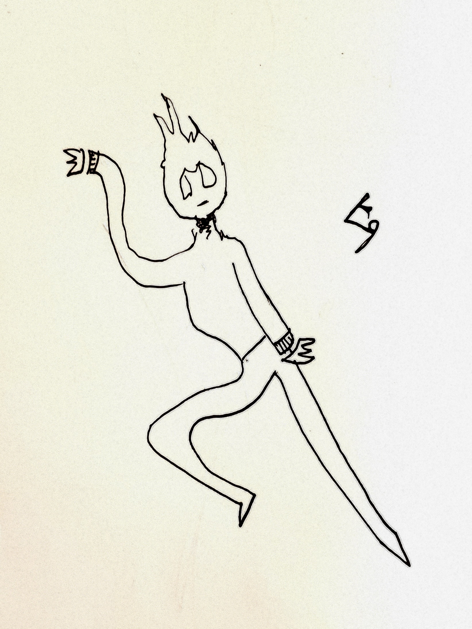 [Ink on notebook page.] From my field notebook. This is my sketch of the famous ghoul dancer, Kim Flobotomus. She/he has thrilled undead audiences for centuries with her/his strangely dramatic rhythmic pantomimes... ---Richard F. Yates (Holy Fool)
