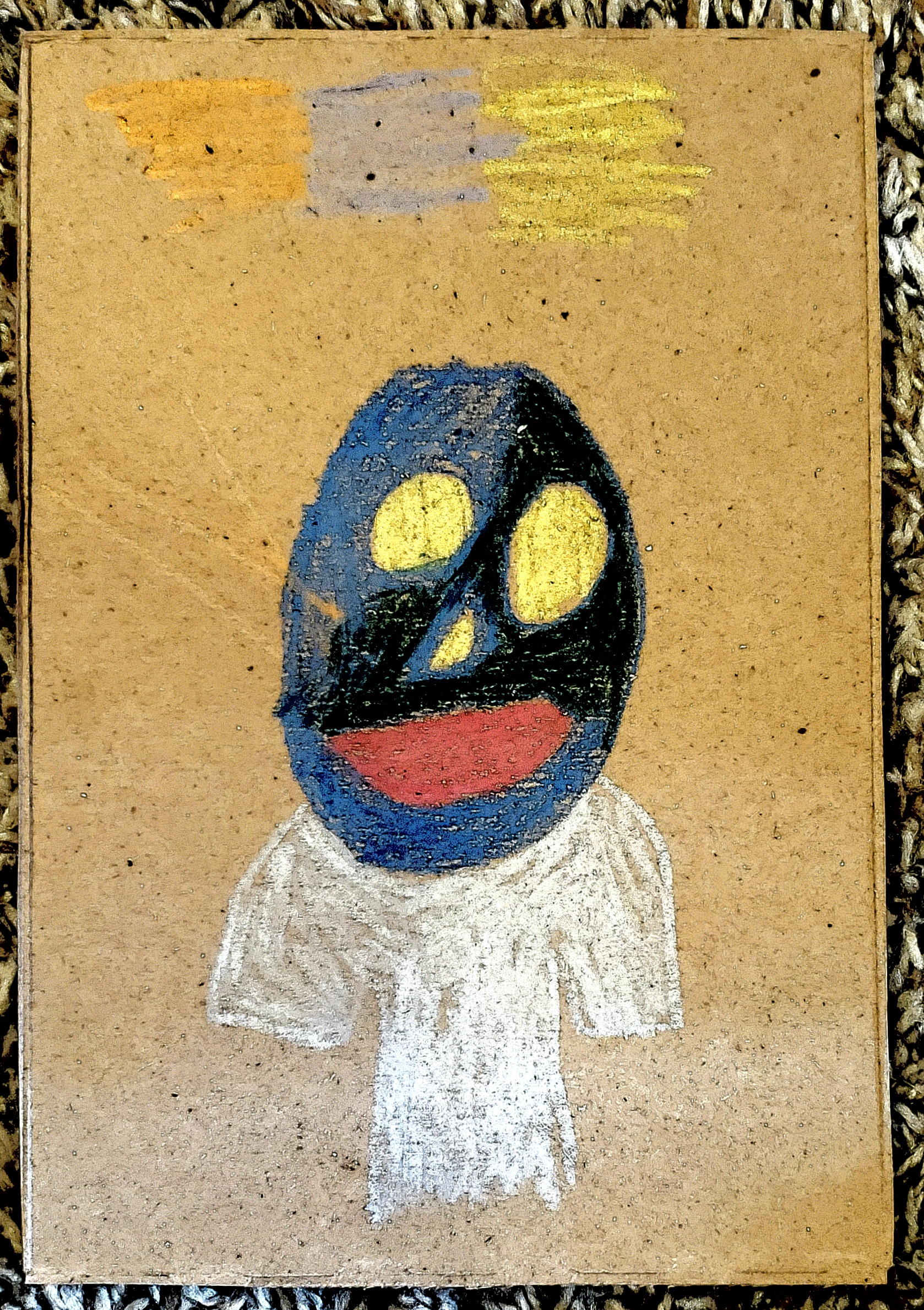 [Crayon and wax pencil on reclaimed cardboard with digital embellishments.]