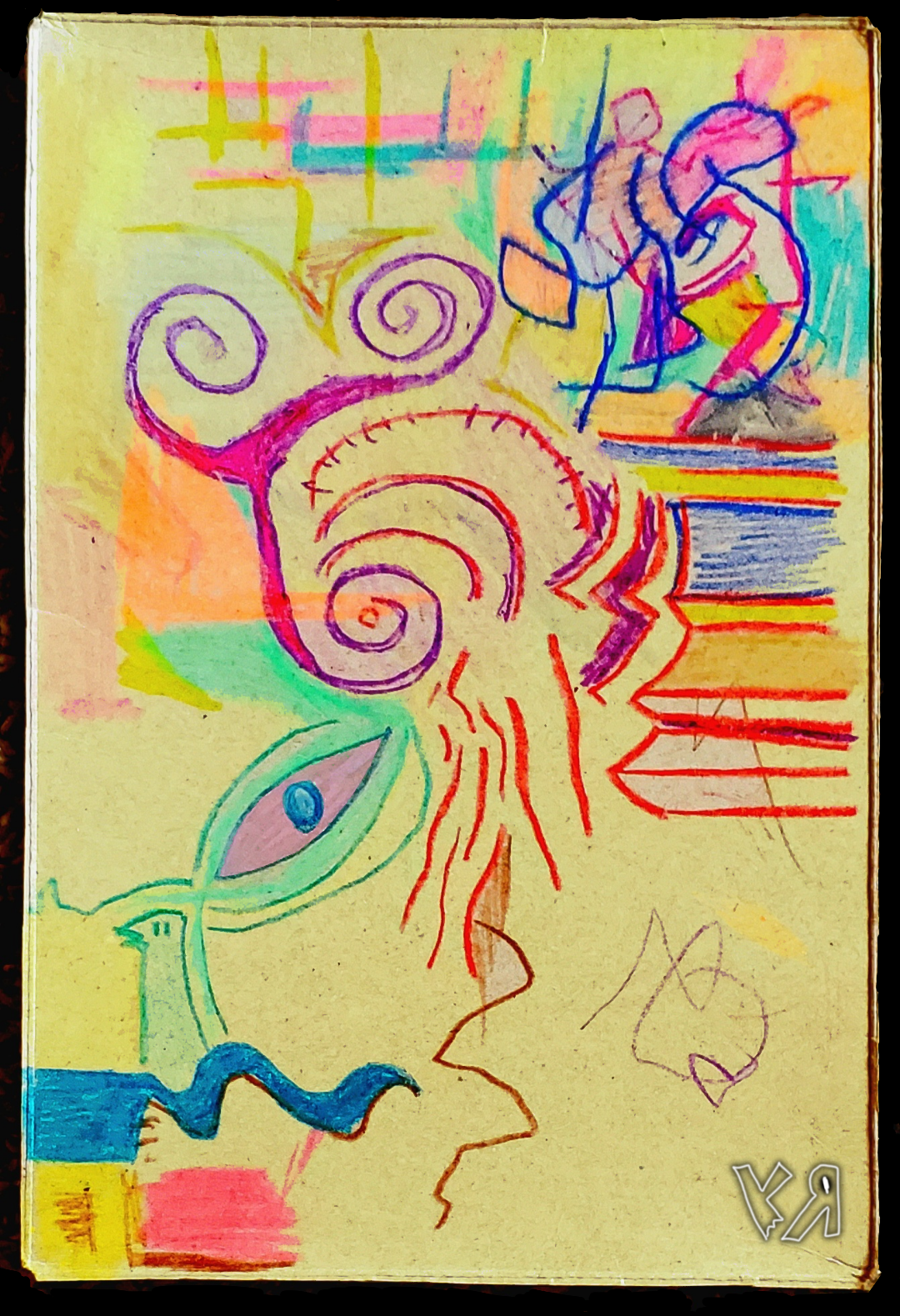 [Crayon and colored pencil on reclaimed cardboard with digital embellishment and color, and a dash of shamanistic psycho-tourism.]
