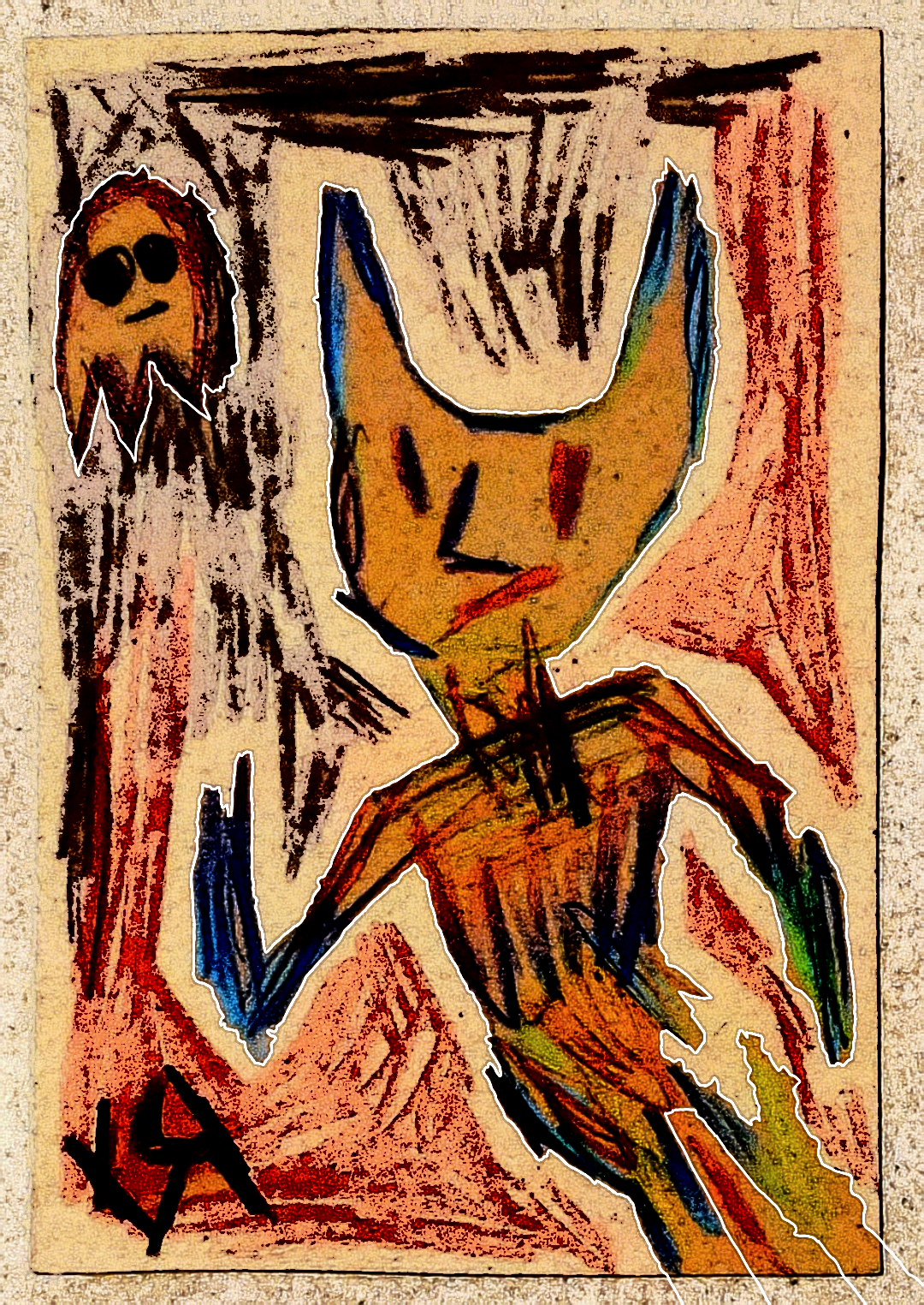 [Felt pen, crayon, and colored pencil on reclaimed cardboard with digital embellishments and color.]