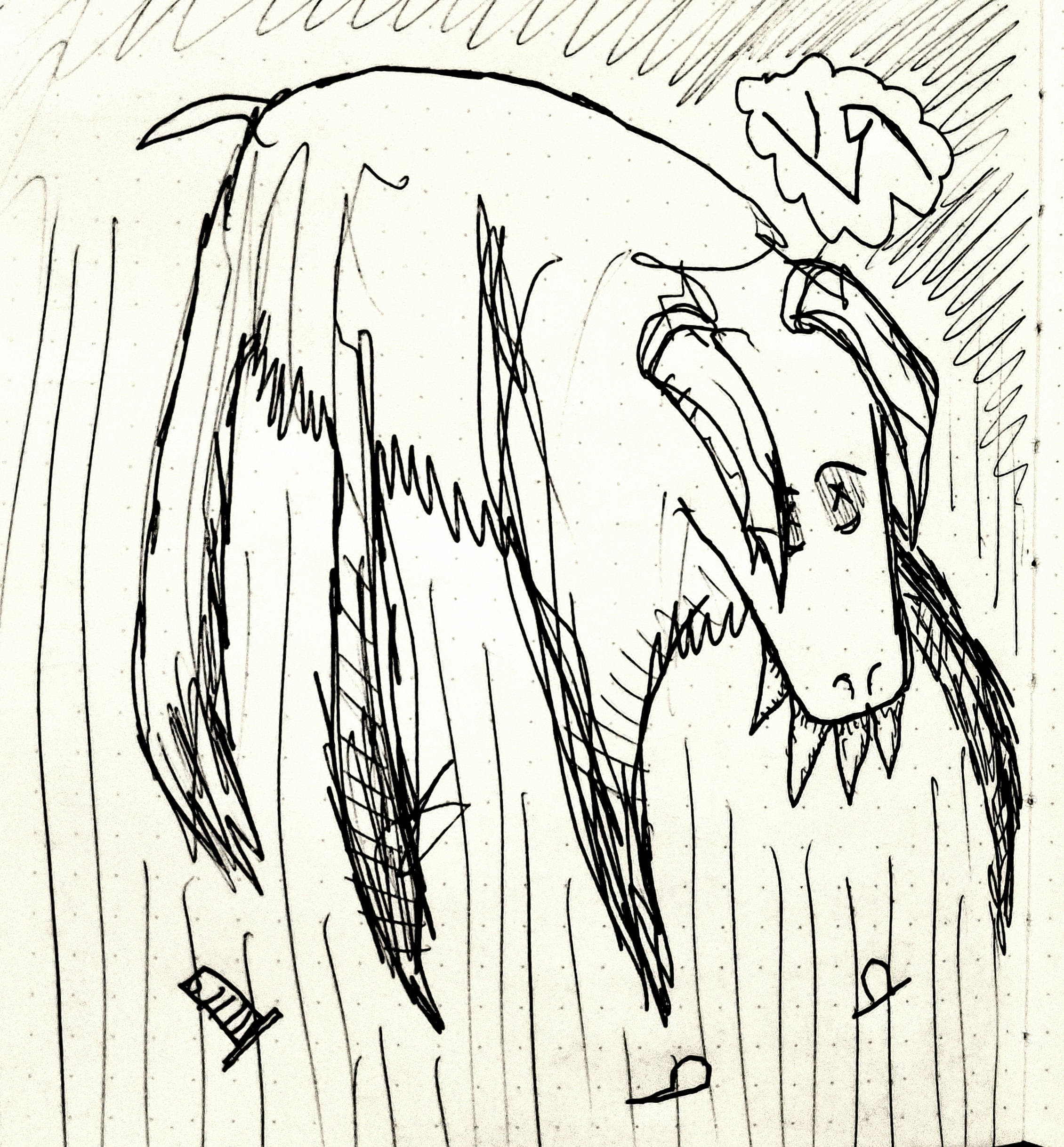 [Liner pen on notebook page with digital embellishments.] Shag loved to play music...but he wasn't that great at it... Maybe he'll be an outsider monster artist someday! (He could tour with a Tiny Tim tribute band!) ---Richard F. Yates (Holy Fool)