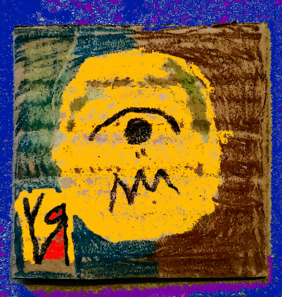 [Crayon on reclaimed cardboard with digital embellishments and color.] It's just so damn simple... However, for some reason, it makes me laugh! (Perhaps it's because the little cyclops looks genuinely perturbed.) ---Richard F. Yates (Holy Fool)