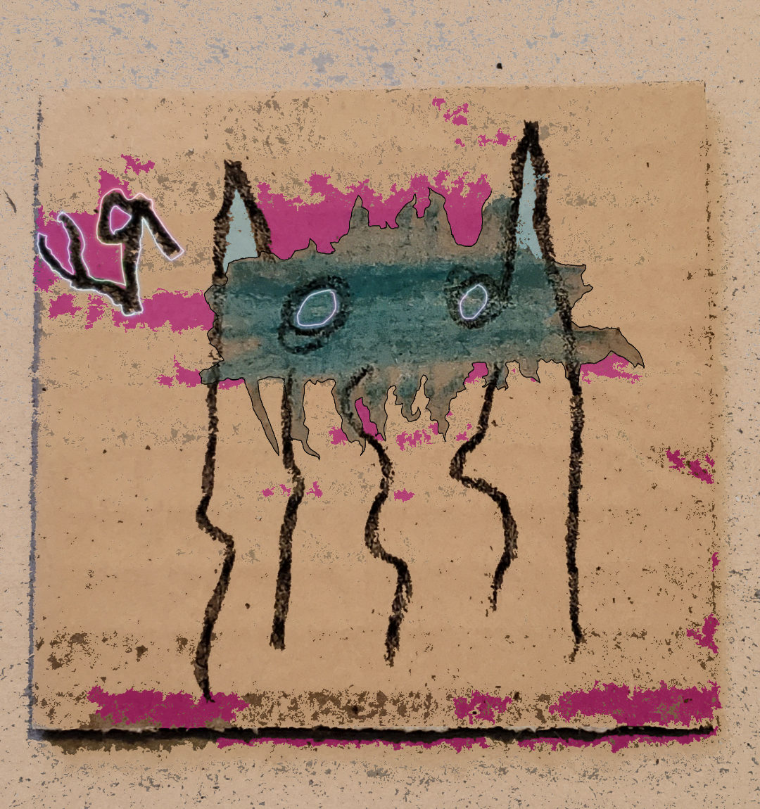 [Crayon on reclaimed cardboard with digital embellishments and color.]