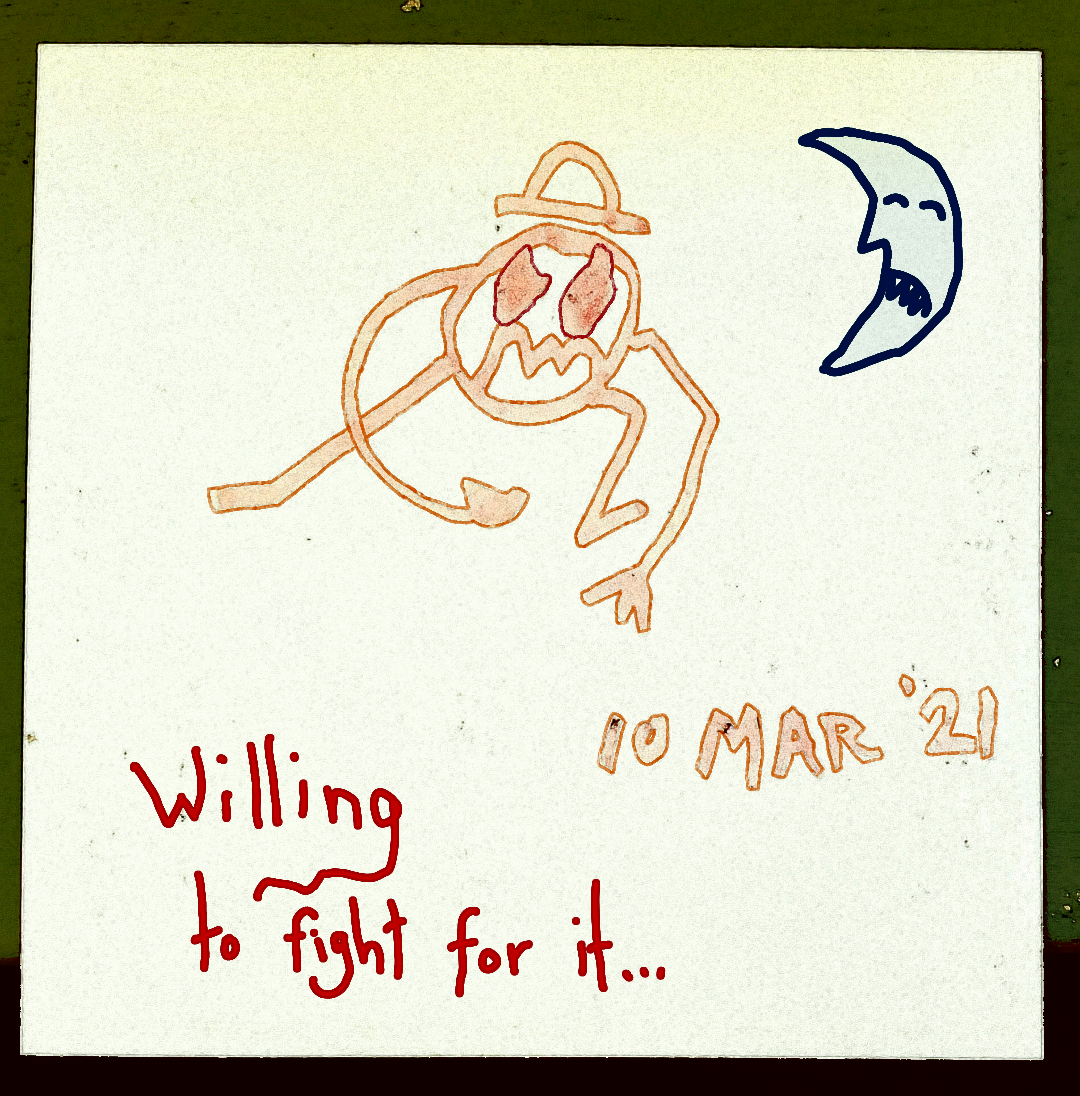 [Felt pen on notecard with digital embellishments and color.] This grumpkin is ready to sock someone in the nose, even Mr. Moon, if that's what it takes! (That's some powerful conviction for a guy with no body!) ---Richard F. Yates (Holy Fool)