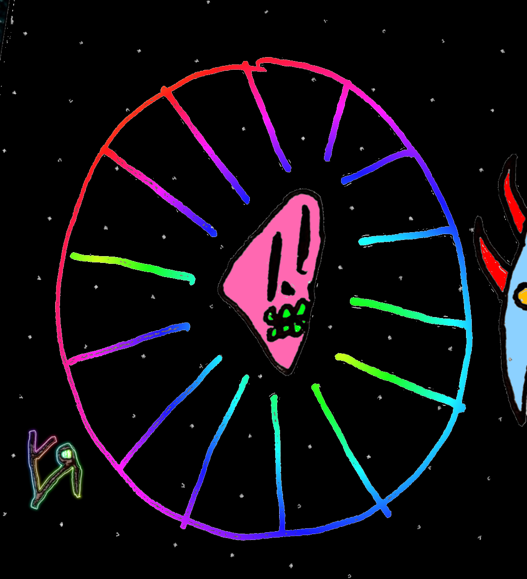 [Liner pen on notebook page with digital embellishments and color.] A cosmic figure, its neon-fuchsia skull surrounded by throbbing pistons of energy, the creature hovered over the landscape, scowling down at all below, for what seemed like ages. All the monsters beneath its gaze whimpered and cried for their mommies until, mercifully, the creature opened it's vast mouth and bathed the entire planet below in glowing green vomit---instantly melting the entire sphere into atoms. It's judgement rendered, it floated on into the empty spaces between worlds.