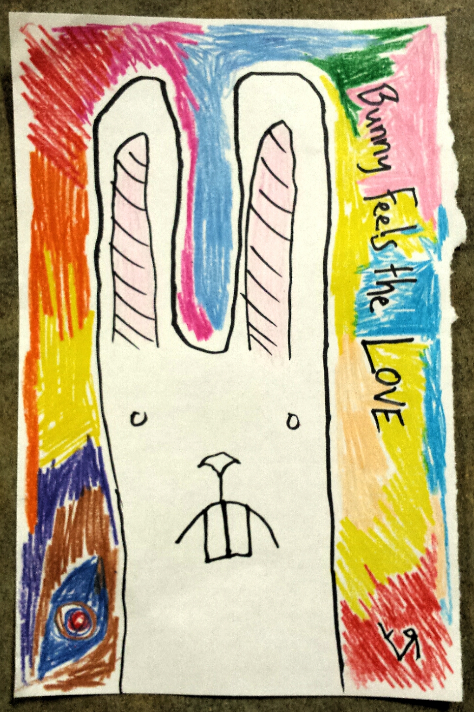 [Liner pen and colored pencil on reclaimed paper with minor digital embellishments.] This bunny looks worried. (I'm guessing that he's seen something that I didn't notice... Always trust the bunny!) ---Richard F. Yates (Holy Fool)