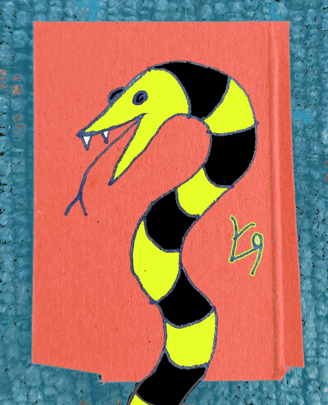 [Felt pen on reclaimed cardboard with digital embellishments and color.] Is that snake smiling? (Is that a good thing or a BAD thing???) ---Richard F. Yates (Holy Fool)