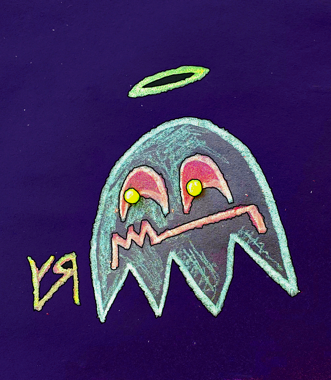 [Paint pen, felt pen, and glitter glue on construction paper with digital embellishments and color.] Ghosts are probably NOT the spirits of deceased humans (or animals) but, instead, are more likely non-corporeal creatures that take the form of something or someONE who a potential viewer would recognize and understand. (If the physical appearance is TOO alien, human cognition tends to filter out the vision or reframe it as something the viewer can relate to, as with the Roman soldiers who reported seeing glowing "SHIELDS" in the sky over a battlefield. Today, we would call them U.A.P.s) This ghost is probably a hideous creature that has change its appearance so that I could capture the vision in a meaningful way... Probably... ---Richard F. Yates (Holy Fool)