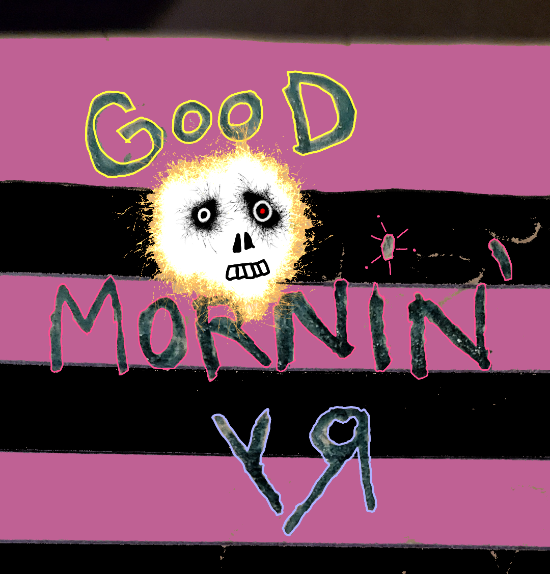 [Ink on notebook page with digital embellishments, drawing, and color.] When you WANT to say "Good Morning!" but the cracks in your psyche are showing through the smile... (And, cuz of the medication, you can't have coffee with caffeine...) ---Richard F. Yates (Holy Fool)