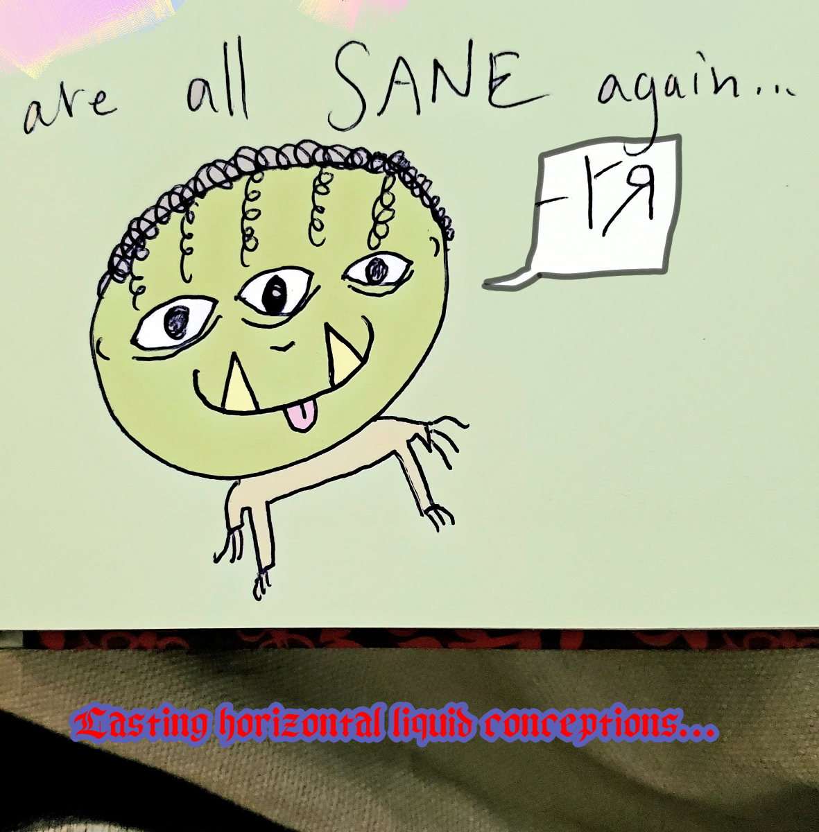 [Ink on notebook page with digital embellishments and color.] You know what? Sometimes, I just like the way words sound. The "meaning" isn't important, but the MONSTER - that's just a beast, ain't it! ---Richard F. Yates (Holy Fool)
