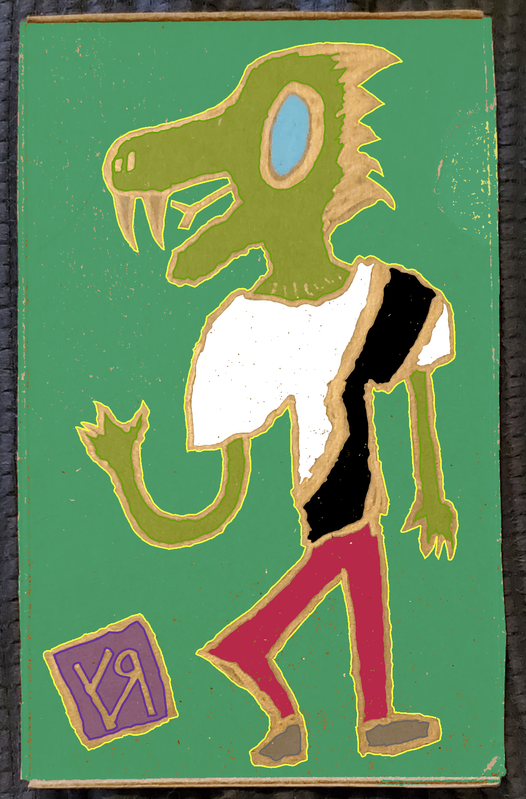 [Metallic marker on reclaimed cardboard with digital embellishments and color.] Sure, he's a dragon-man, but he's got STYLE! Right? (It's been edited out, but Callen (the actor playing the dragon) is OBVIOUSLY smoking a clove in the original photograph. He's cool like that...but we don't want to influence the kiddies to be bad!) ---Richard F. Yates (Holy Fool)