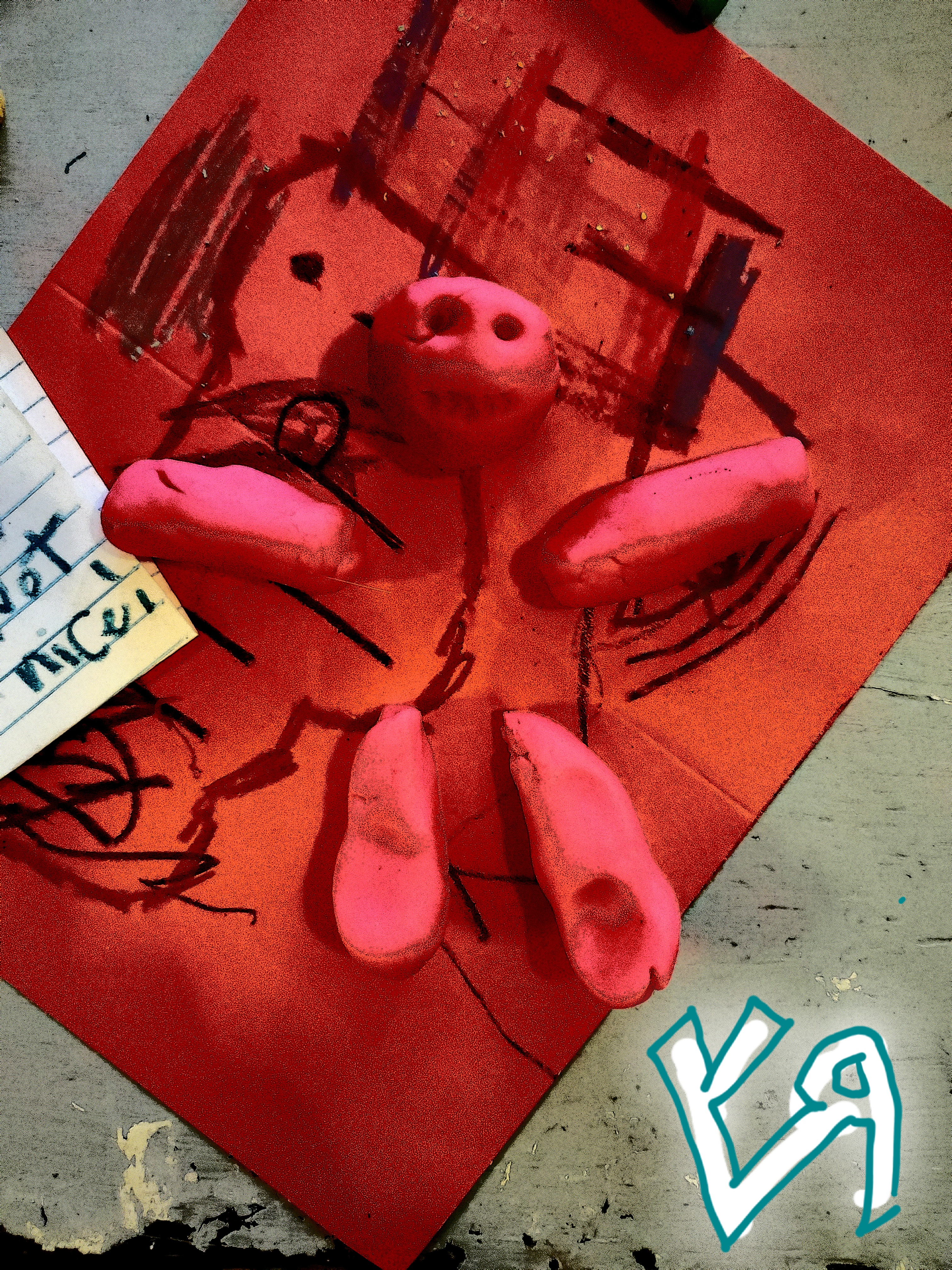[Sculpting dough, ink, crayon, paper collage, with digital embellishments and color.] The granddaughter, Felicity, and I have made many different works of art. Sometimes, we bring many mediums together to create a MASH-UP! This poor creature, being assembled from parts, doesn't appear to have a torso (yet!) (Actually, this is as "finished" as the creature got, so...that's it!) ---Richard F. Yates (Holy Fool) & Felicity Echo Hanson (Toddler Terror)