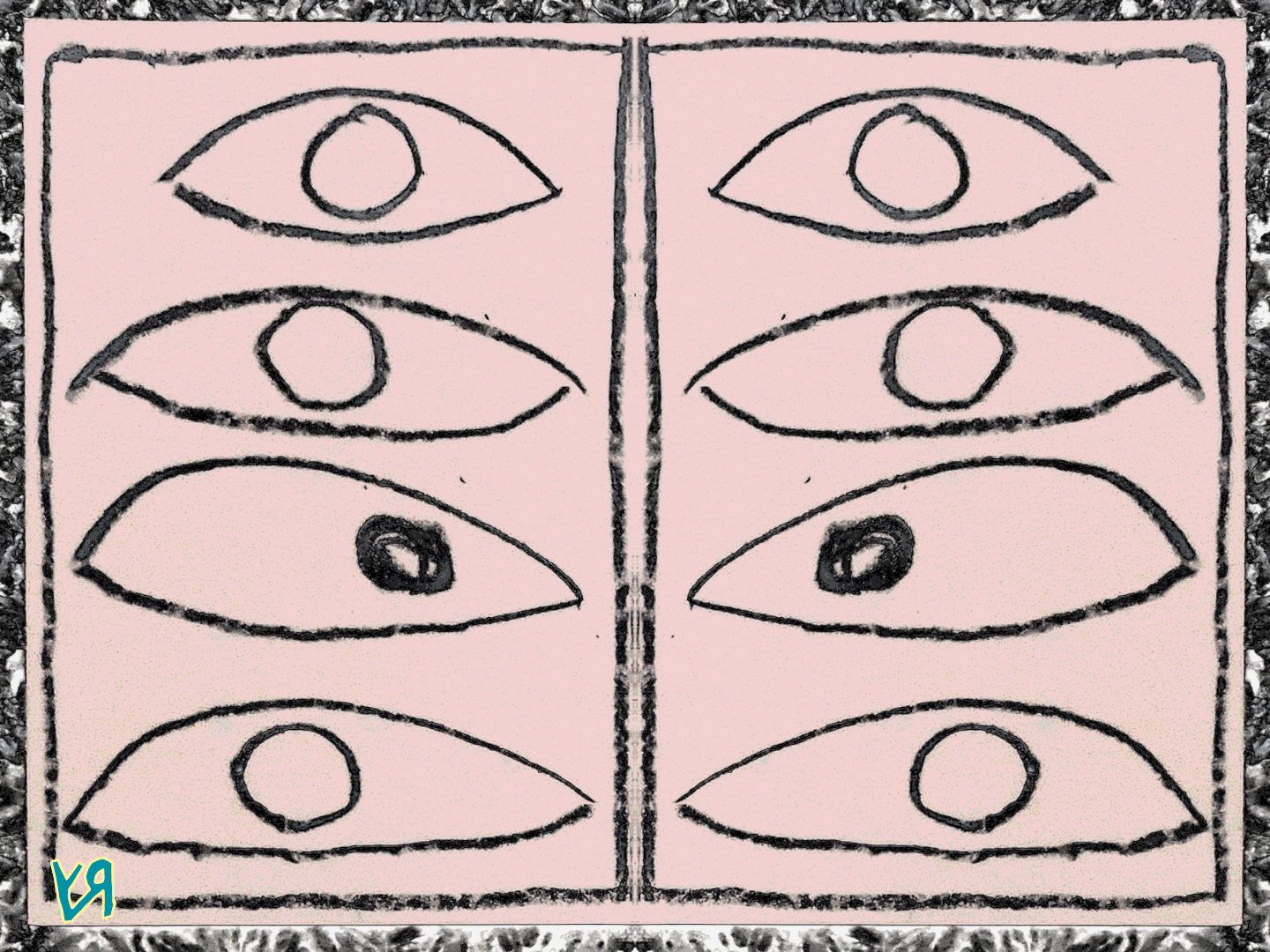 [Crayon on cardstock with digital embellishments, moshing, and color manipulation.] The eyeballs are stacked against us and always watching. Who can break their spell? Who can spell their brakes? The slings and Eros of outrageous fortune cookies all LOOK good in the shop window... Did you ever bat an eye? (Or eye a bat?) Thank you... ---Richard F. Yates (Holy Fool)
