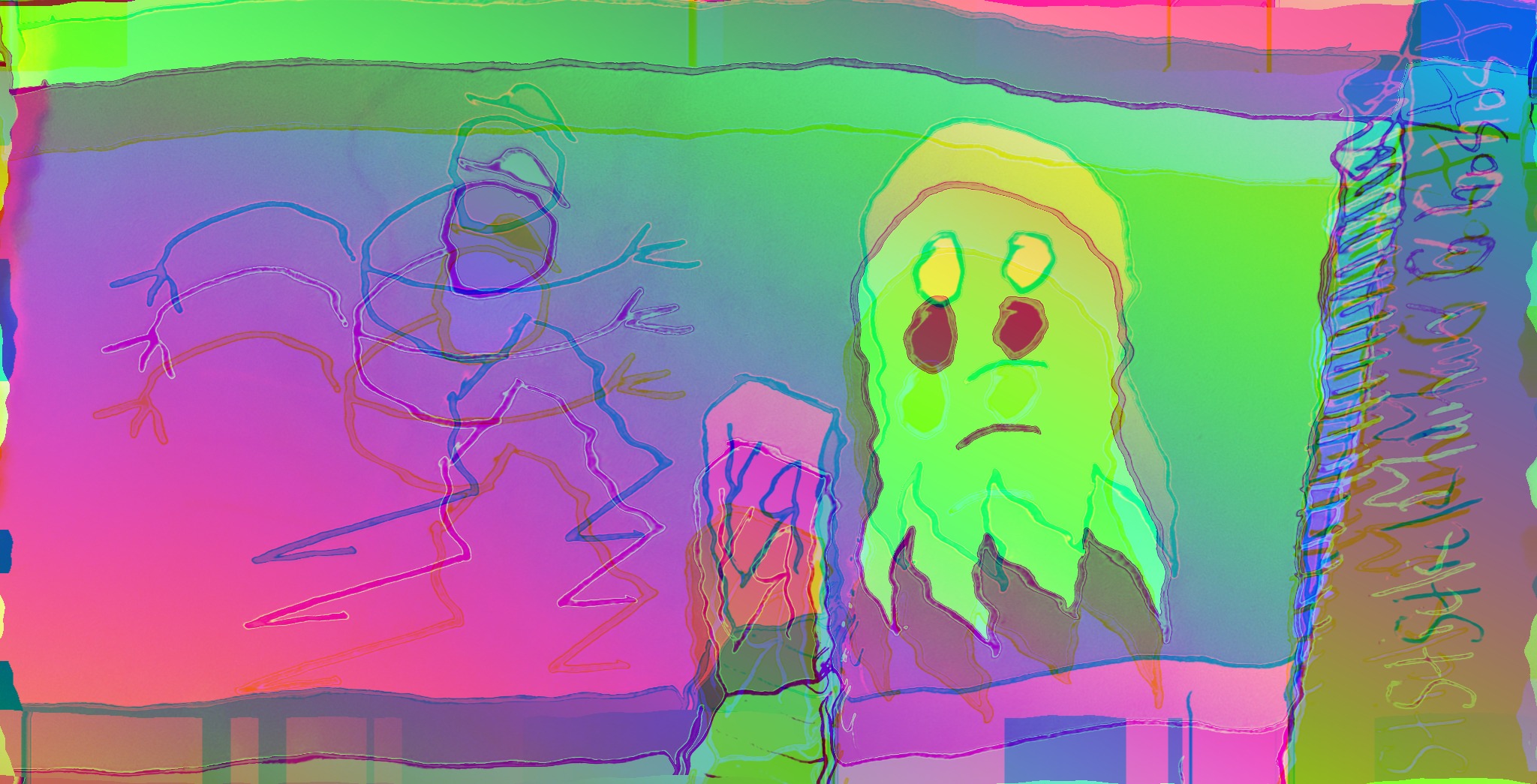 [Ink on notebook page with digital embellishments and moshing.] This is the third version of this piece that I've minted (but the first on HIVE.) Running a simple drawing thru the mosh-o-matic can sometimes produce eerie and unsettling effects, and for an image that is ALREADY about a ghost (and a gunfighter, although you might not know that's what I was trying to draw! Ha!), having the ghostly eyes above the darkened eyes looked pretty cool to me... Thoughts? ---Richard F. Yates (Holy Fool)
