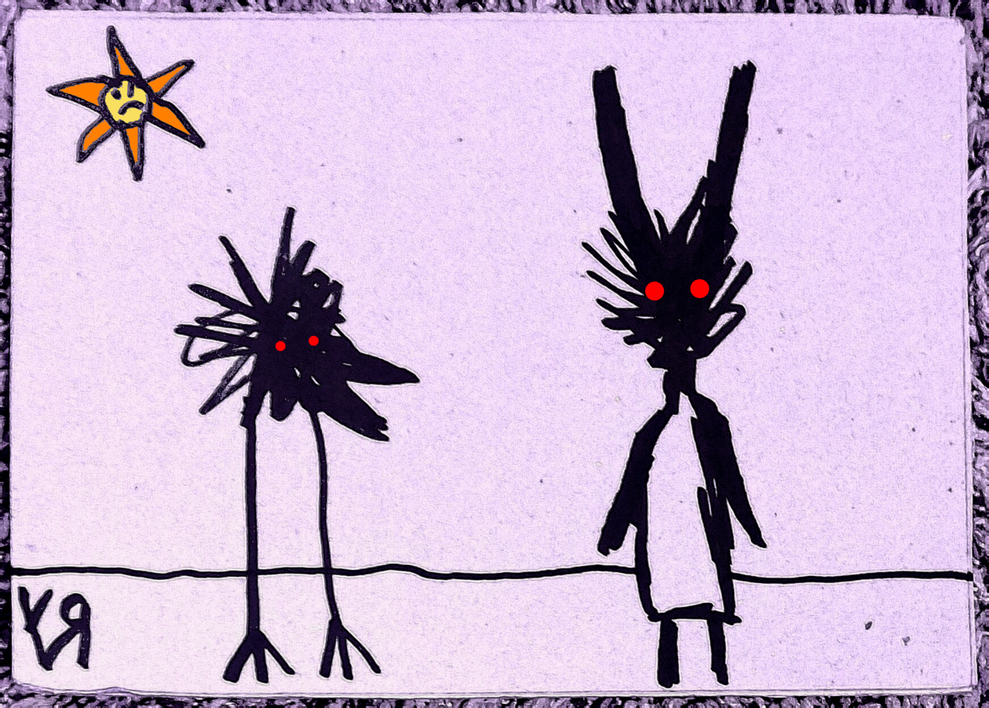 [Sharpie on reclaimed cardboard with digital embellishments and color.] They come out at dusk. The judge. There is NO appeal... ---Richard F. Yates (Holy Fool)