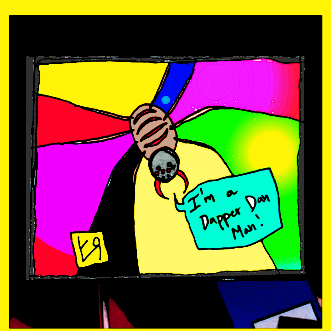 [Ink on notebook page with digital embellishments and color. 2020.] I don't want FOP, goddammit! I'm a Dapper Dan man! ---Richard F. Yates (Holy Fool)