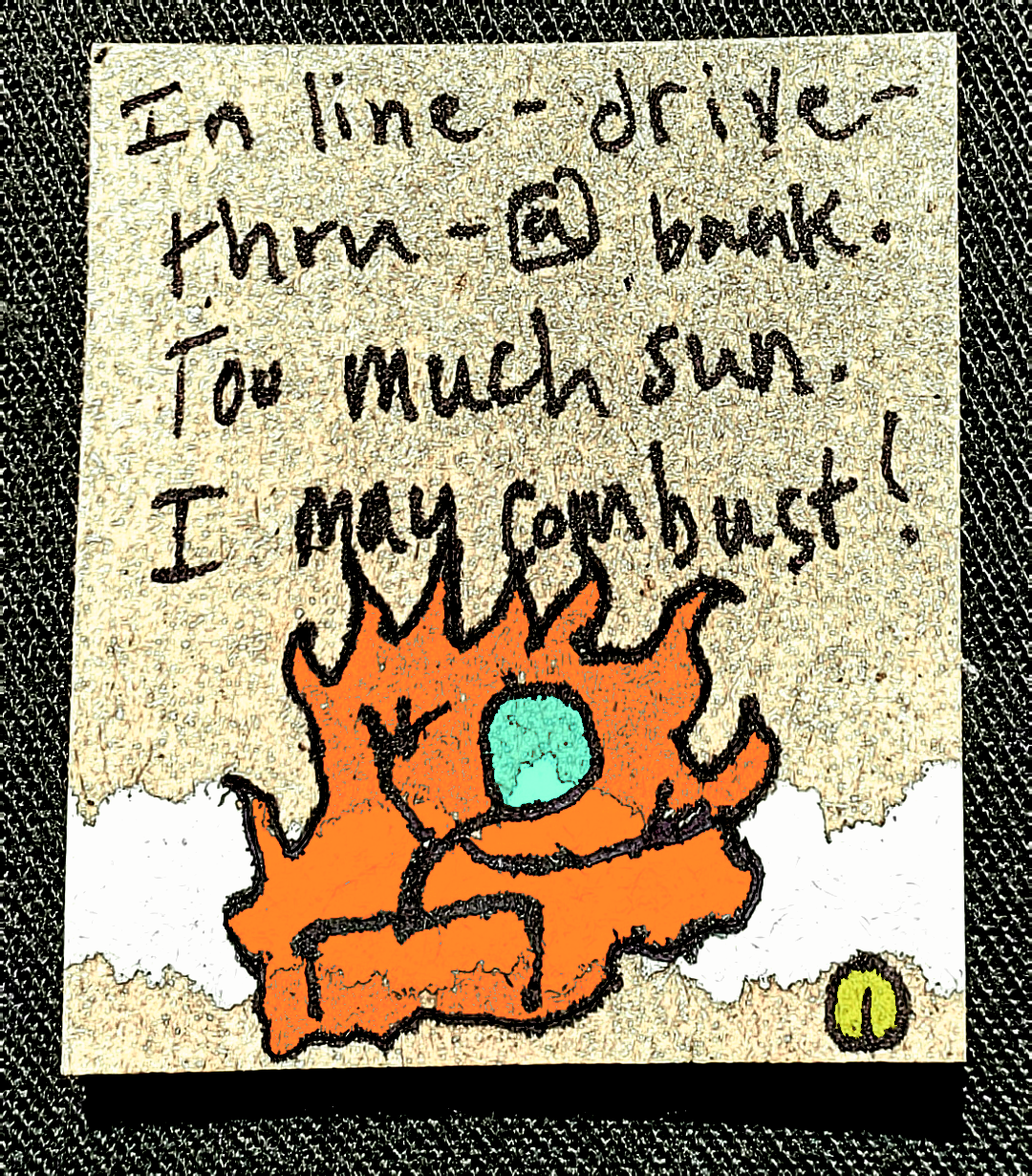 [Sharpie on tiny piece of reclaimed cardboard with digital embellishments and color.] True story!!! (I primarily enjoy the textures of this one...) ---Richard F. Yates (Holy Fool)