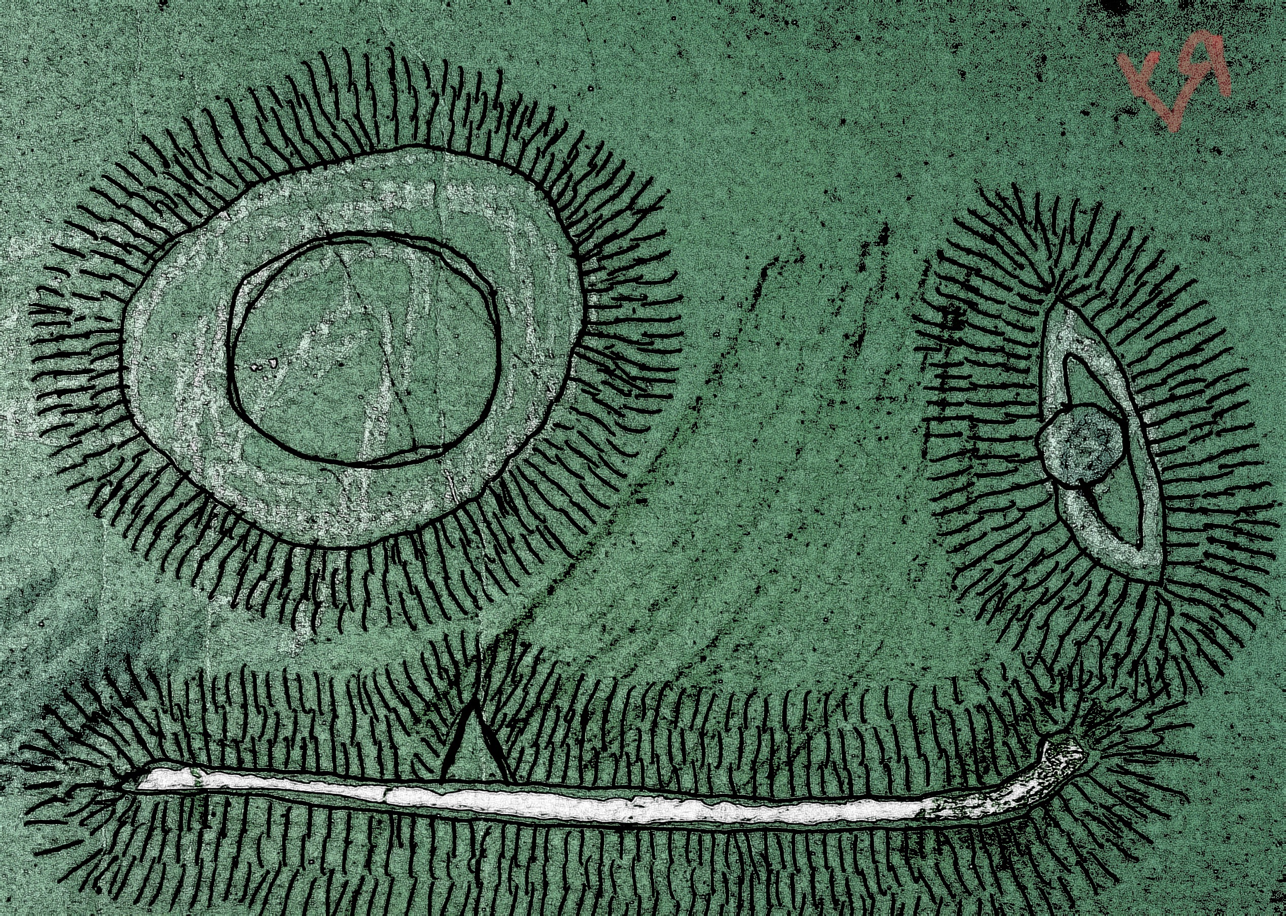 [Ink and crayon on reclaimed cardboard with digital embellishments and color.]