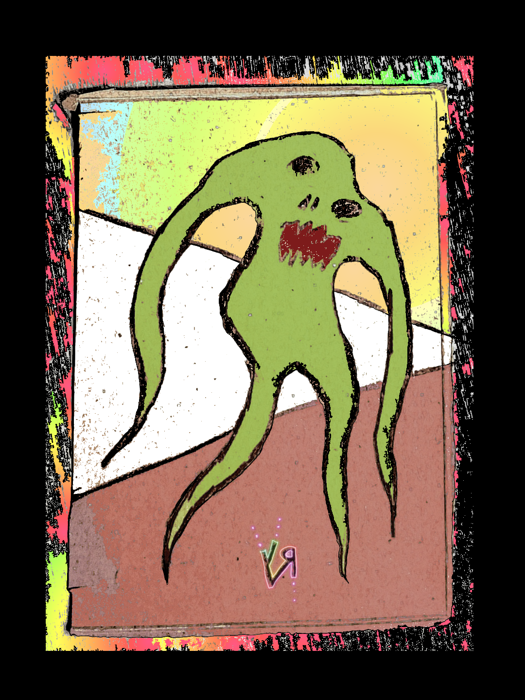 [Ink on reclaimed cardboard with digital embellishments and color.]