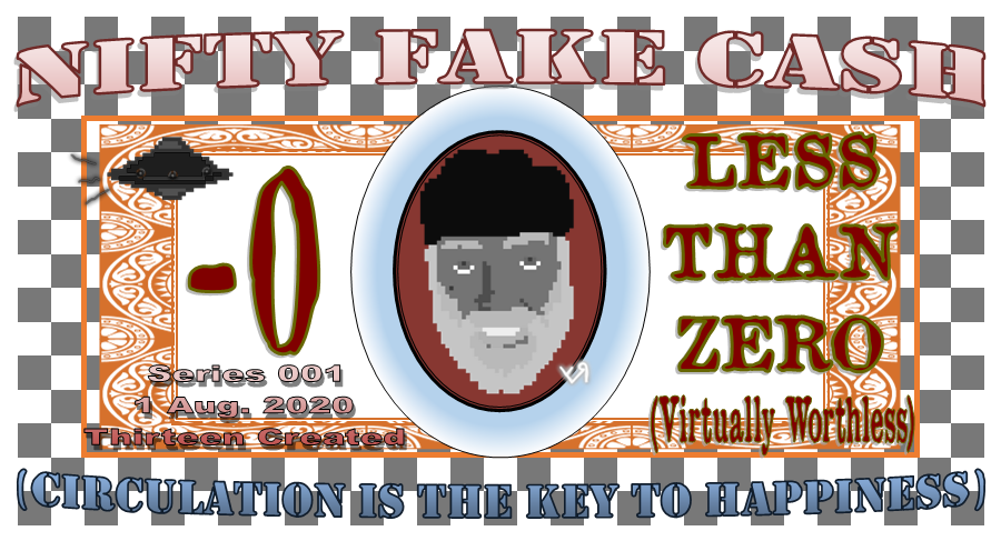 Need some cash? Of course you do. We all need cash---unless we're one of the LIZARD PEOPLE, in which case, we're doing fine. But YOU, I'm pretty sure that YOU need some cash. We'll, I've minted some fancy NIFTY CASH for all the digital currency fans out there! Sure it's fake, but that doesn't mean it's WORTHLESS. Worth less than WHAT? Some national FIAT? That shit's going DOWN in value right now. This digital stuff, though... See where I'm going with this??? (Not financial advice. In fact, if you take financial advice from a person who mentions "lizard people," you probably deserve what you get!!!)