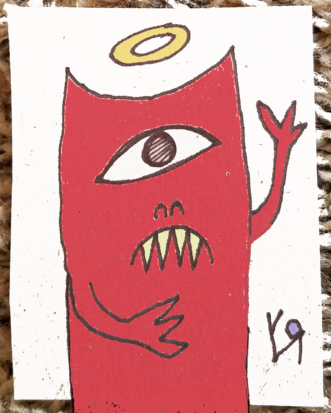 This is---in a way---a self portrait. The primary fictions here are that I'm not red (more pale in "real life,") I have a beard, and my halo is much MUCH dingier, but other than those things, it's pretty accurate...