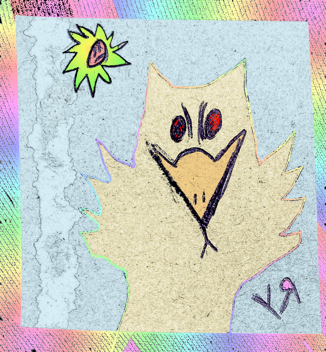 [Ink on small piece of reclaimed cardboard with digital embellishments and color.]