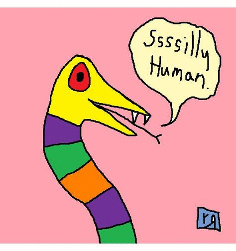 This piece came from a collaboration I did over the course of a few weeks with a friend of mine, Richard O'Brien (of the Chehalis O'Briens.) He would come up with some nasty, nihilistic, but humorous title, and then a "punch-line" that included a lot of "S"s, so our character could hiss, and then I would draw the "joke." (Sick joke, usually.) After making a dozen or so of these cartoons, (which we thought were very funny and published on our Art/Lit blog: The Primitive Entertainment Workshop---but that nobody else ever noticed existed), I compiled them all into a wickedly primitive slide show using an online gif making site. To ME, since I can't ever draw anything the same way twice (you need SKILL for that), it looks like Snake is dancing all over the place! Neat!