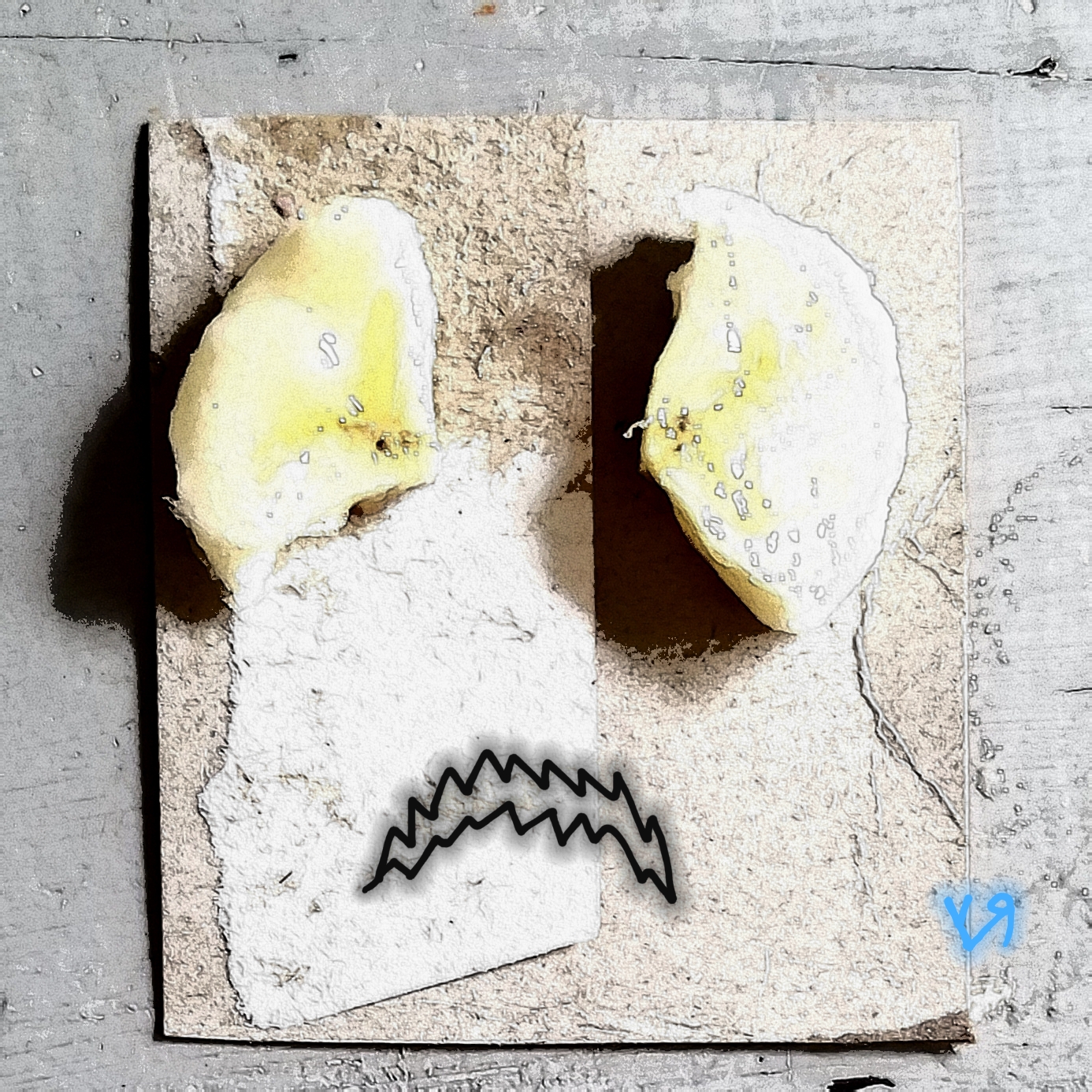 This is an early collaboration between my granddaughter and me. I've been TRYING to get her to draw with me since she was a few months old, but until recently, she's been more interested in putting the crayons and cardboard (cardboard is tougher to rip than paper) in her MOUTH than in drawing with them. With this piece, however, she was feeling INSPIRED and plunked a chunk of banana on one of the smaller pieces of cardboard that I'd brought to the table. I liked it---immediately caught where she was going with the piece---and I added a second piece of banana! Next, I photographed and embellished the image using digital magic. Unfortunately, the original piece HAS been destroyed at this point. (Banana, in general, isn't a great medium for artistic expression---unless you also use duct tape...) However, this DIGITAL documentation LIVES ON!!! And now, one lucky entity can officially OWN this brilliant piece!
