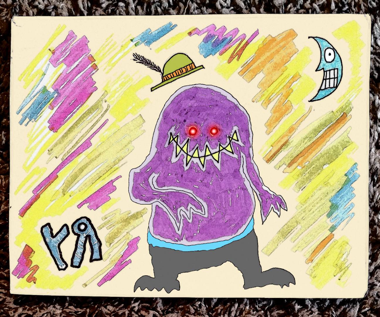 [Felt pen and Sharpie on reclaimed cardboard with digital embellishments and color. 2019.]