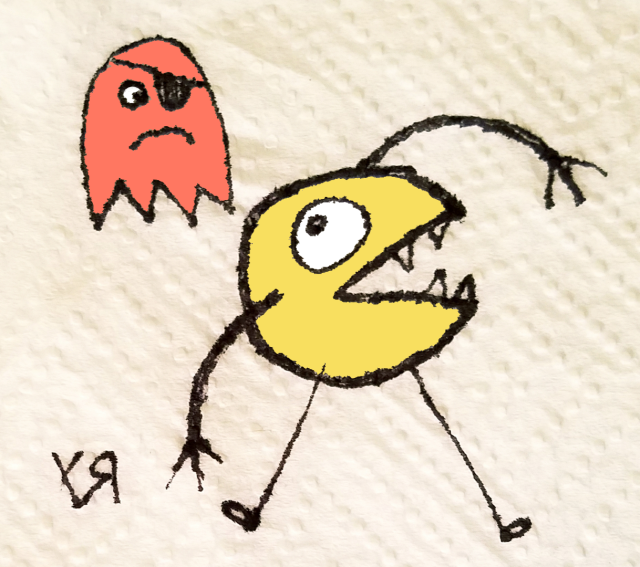 [Sharpie on napkin with digital embellishments and color.] Yeah, you go get your stupid power-pill... Here comes Cousin Steve... Yeah... You better run!!! ---Richard F. Yates (Holy Fool)