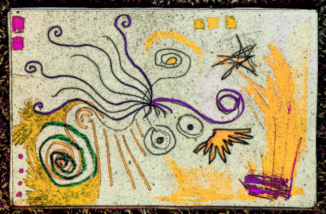 [Pens and crayon on reclaimed cardboard with digital embellishments and color.]