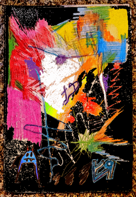 [Crayon, felt pen, and colored pencil on found cardboard with digital embellishments and color.]