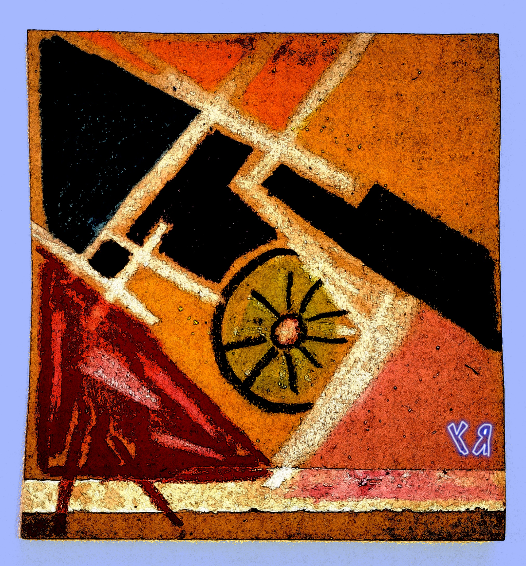 [Crayon on small piece of reclaimed cardboard with digital embellishments and color.]