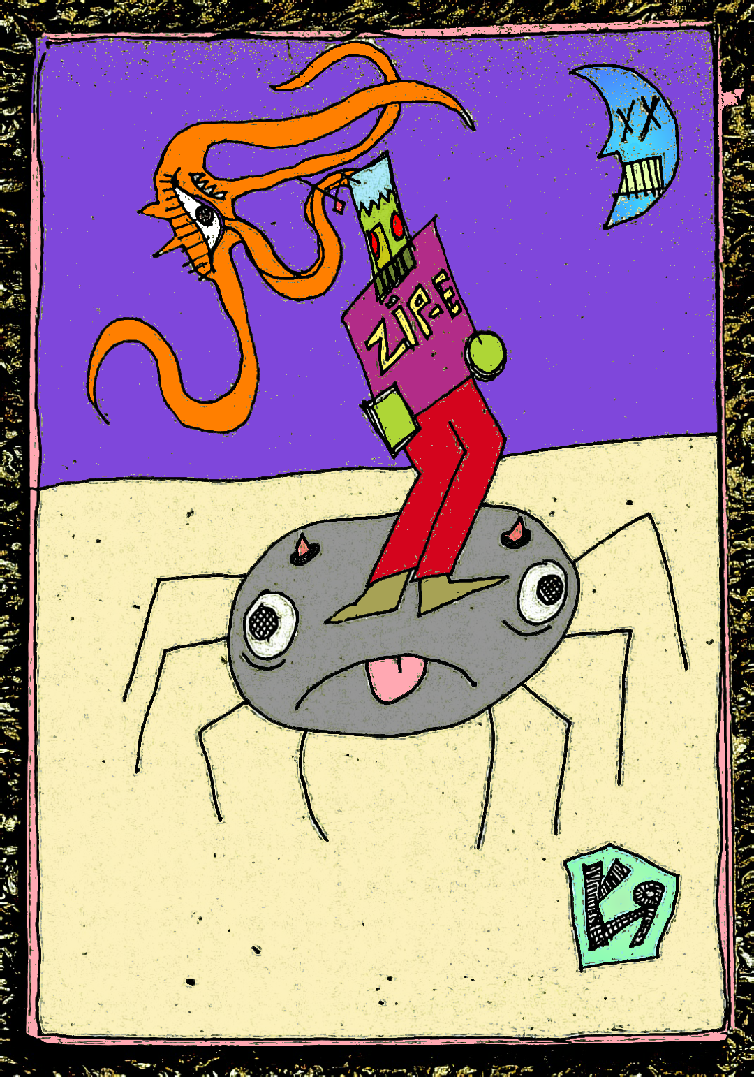 [Sharpie on reclaimed cardboard with digital embellishments and color.] You think surfing on a surf-board is tough! Try surfing on a GIANT SPIDER!!!! ---Richard F. Yates (Holy Fool)