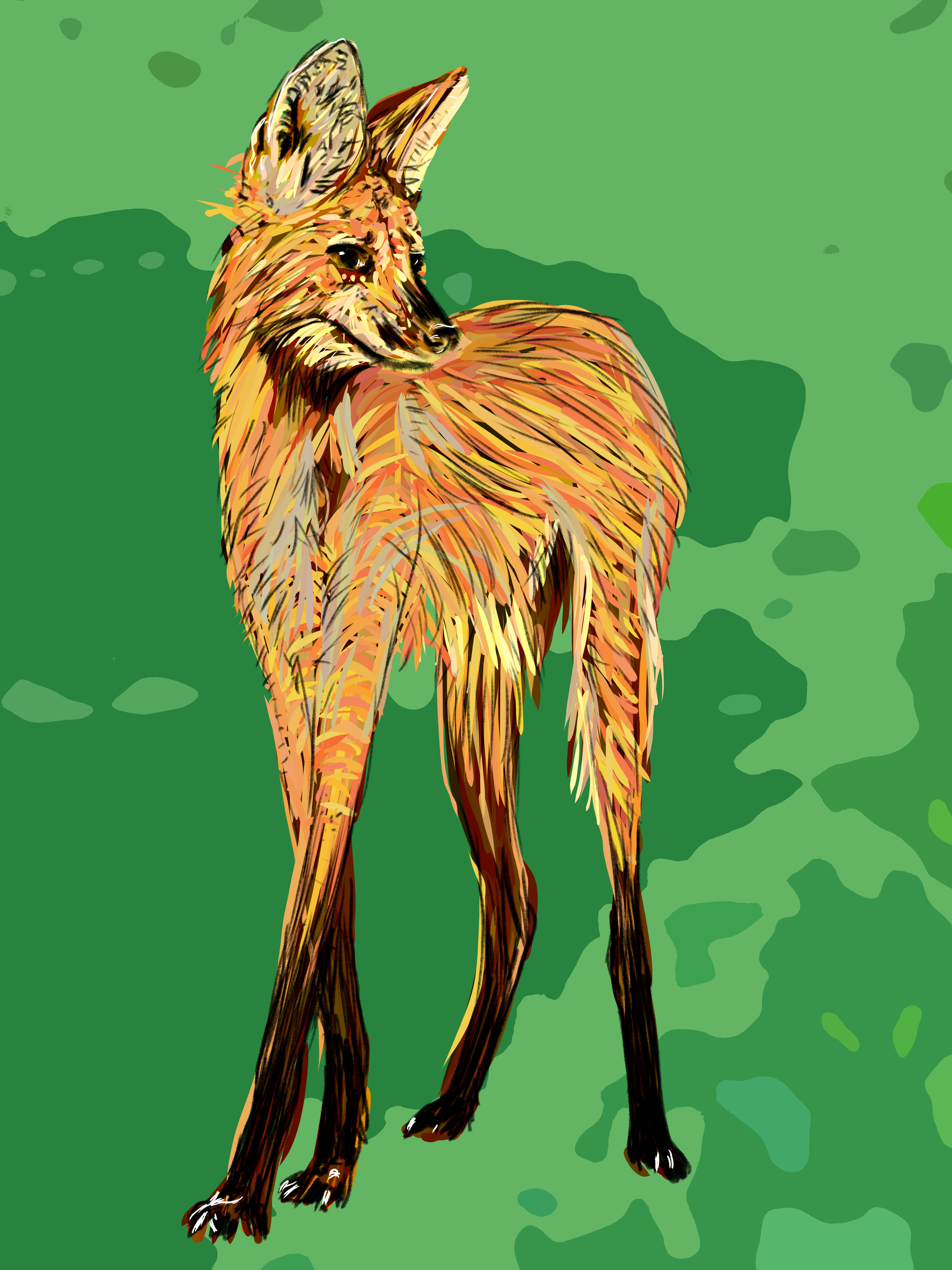 The maned wolf (scientific name: Chrysocyon brachyurus) is a species of canid endemic to South America and the only member of the genus Chrysocyon. Probably the closest living species is the vinegar dog (Speothos venaticus). It occurs in savannas and open areas in central Brazil, Paraguay, Argentina and Bolivia, being a typical animal of the Cerrado.