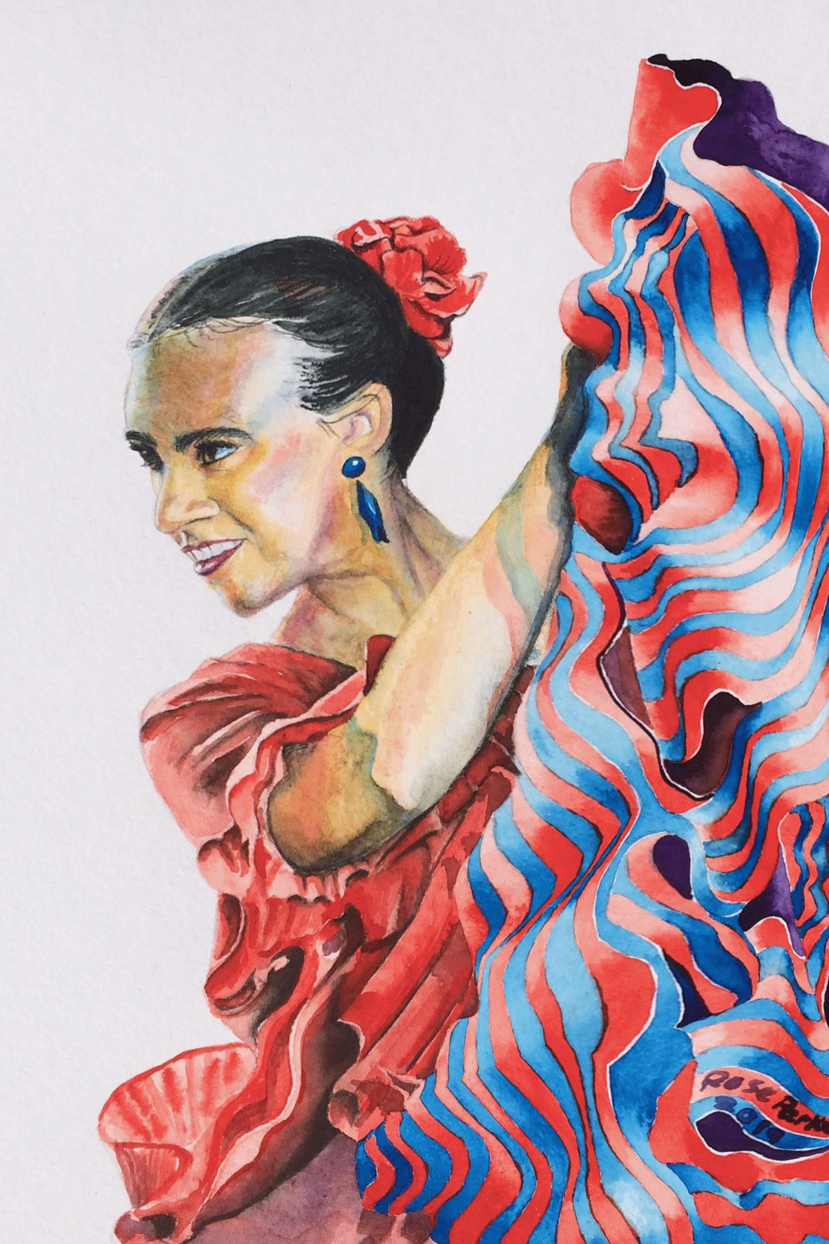 Spanish Flamnco Dancer painted in 2019 by professional artist Rose Parker. It is part of her "La Fiesta" Collection which aims to celebrate the beauty and charisma of spanish life which she now enjoys to the full.