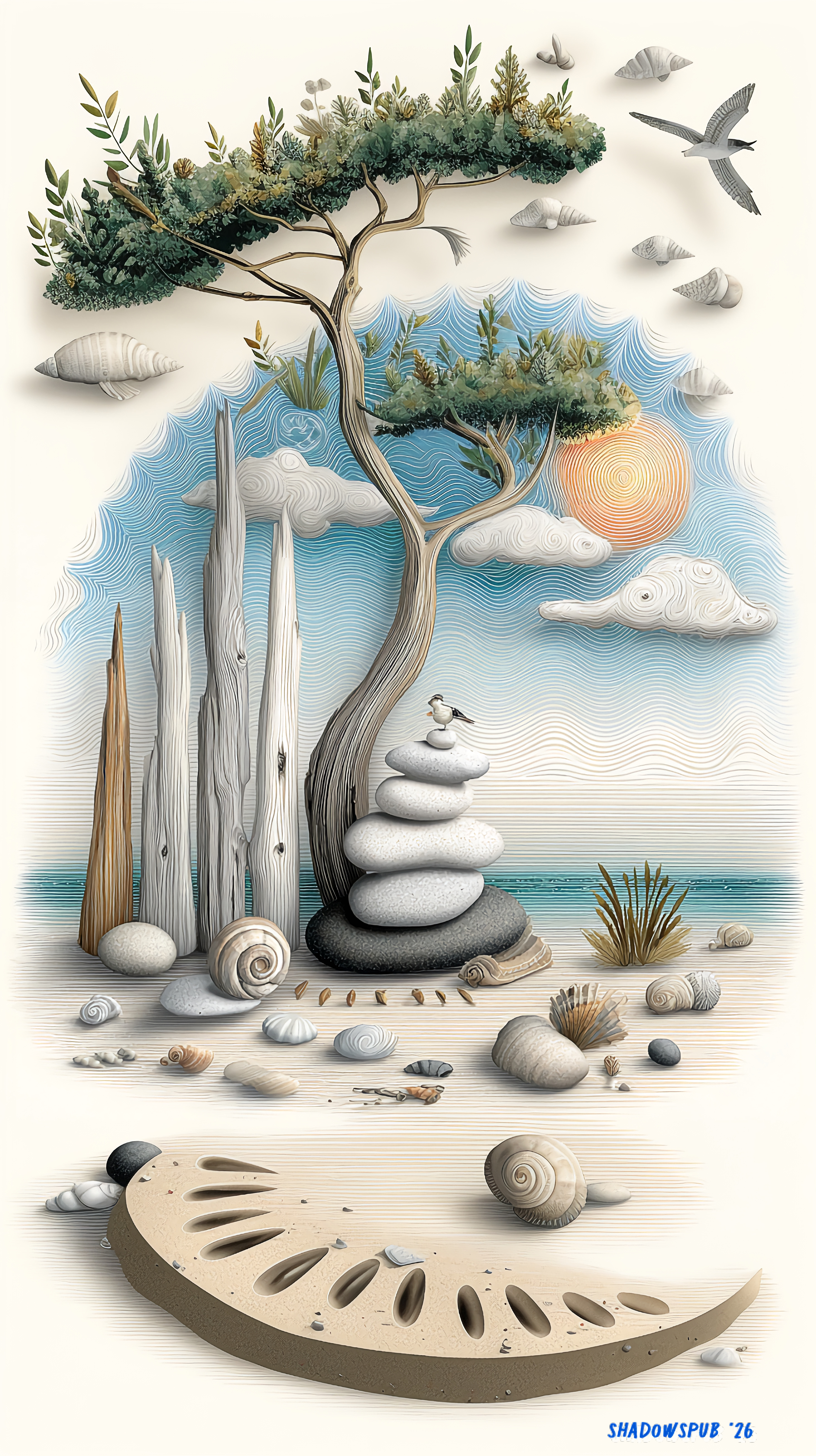 A serene coastal moment where balanced stones, wind-shaped trees, and scattered shells echo the slow rhythm of the sea and the quiet harmony found in nature.
