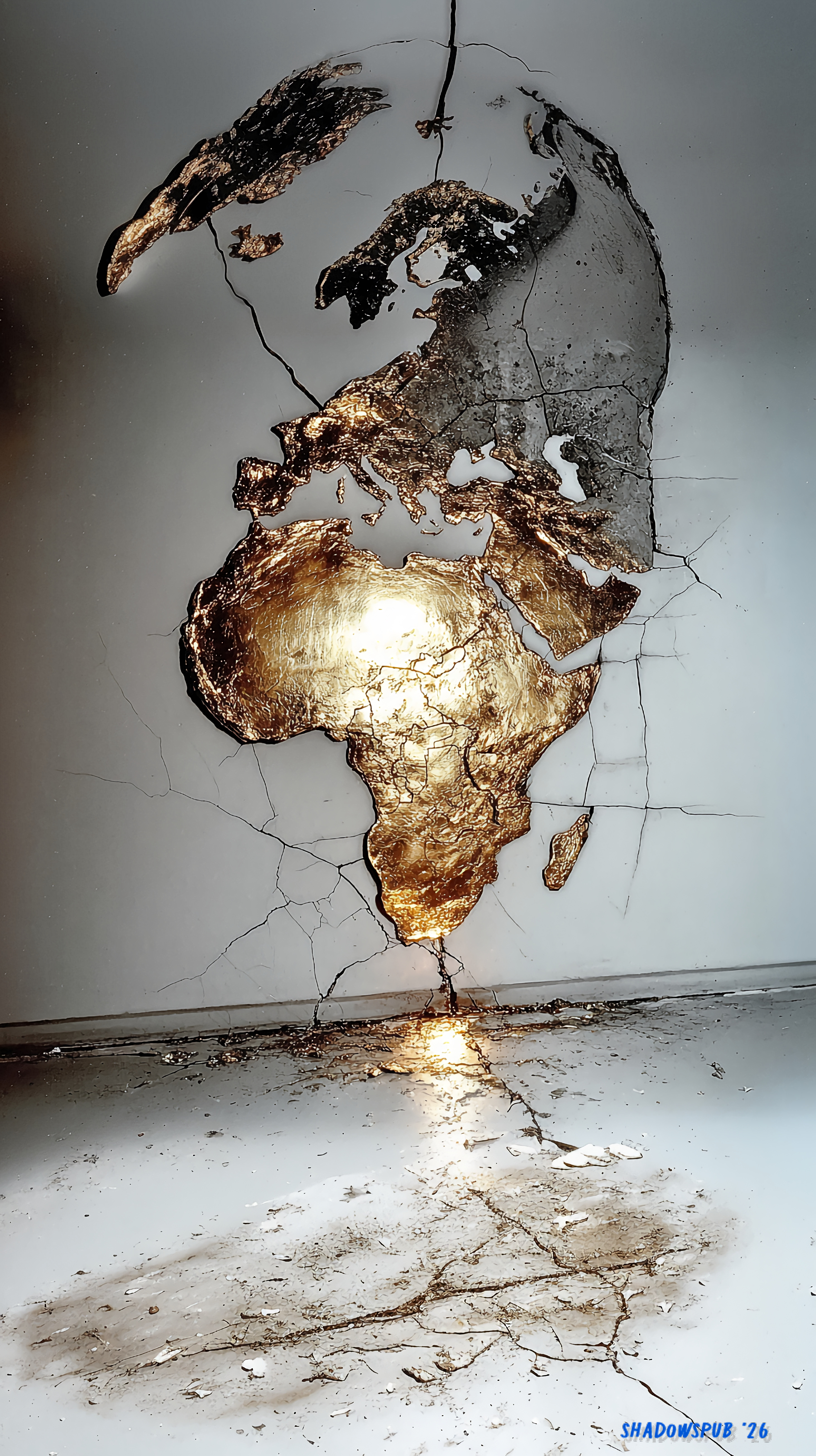 *Gilded Map* shows a cracked, minimalist wall bearing a fragmented world map, with Africa and parts of Europe and the Middle East rendered in molten gold. The metallic surface glows against the pale background, as if the continents are breaking through the wall. Light spills downward, pooling on the floor, suggesting wealth, damage, and fragility coexisting in the same space.