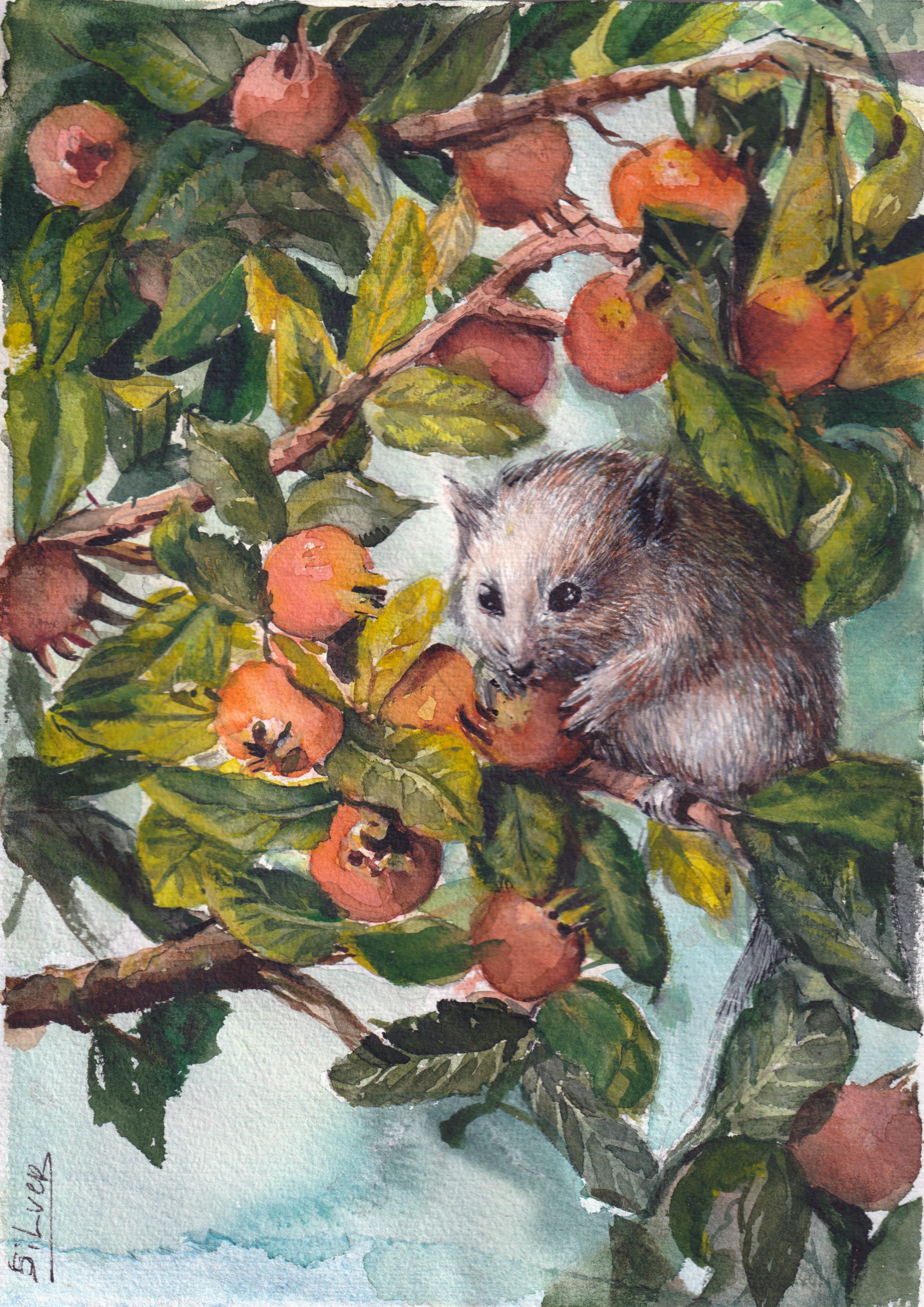 This one came from real medlars and an imaginary creature. Digitalized watercolor, 2417x3418 px.