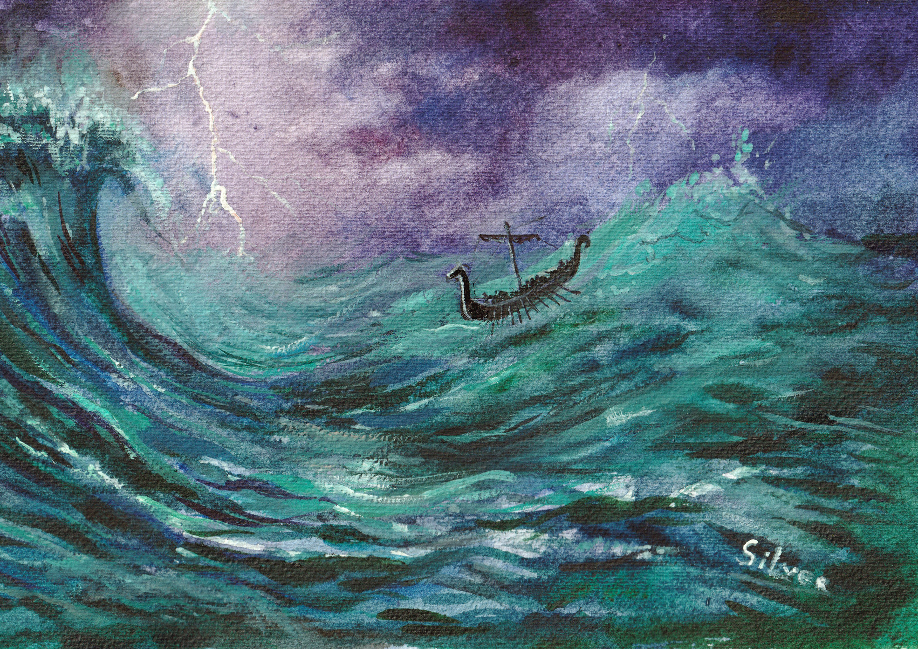 A Viking longship fighting the ocean waves during a storm. The concept says it has a mythic origin. One would think Thor is angry.