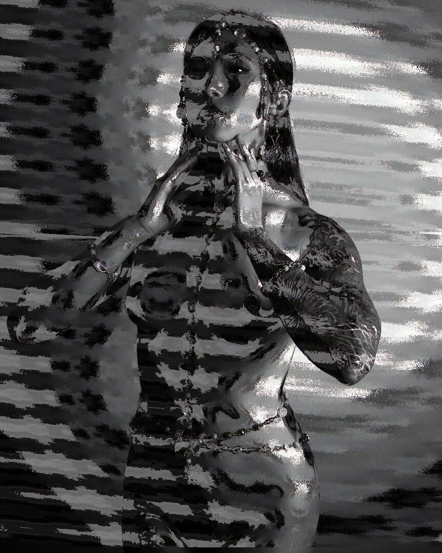This piece is an original photograph of a model that that has been put through a few methods of unconventional processing. I glitched about 10 different copies of this image and them combined them in a cool fashion. The original photo was taken in my home studio.