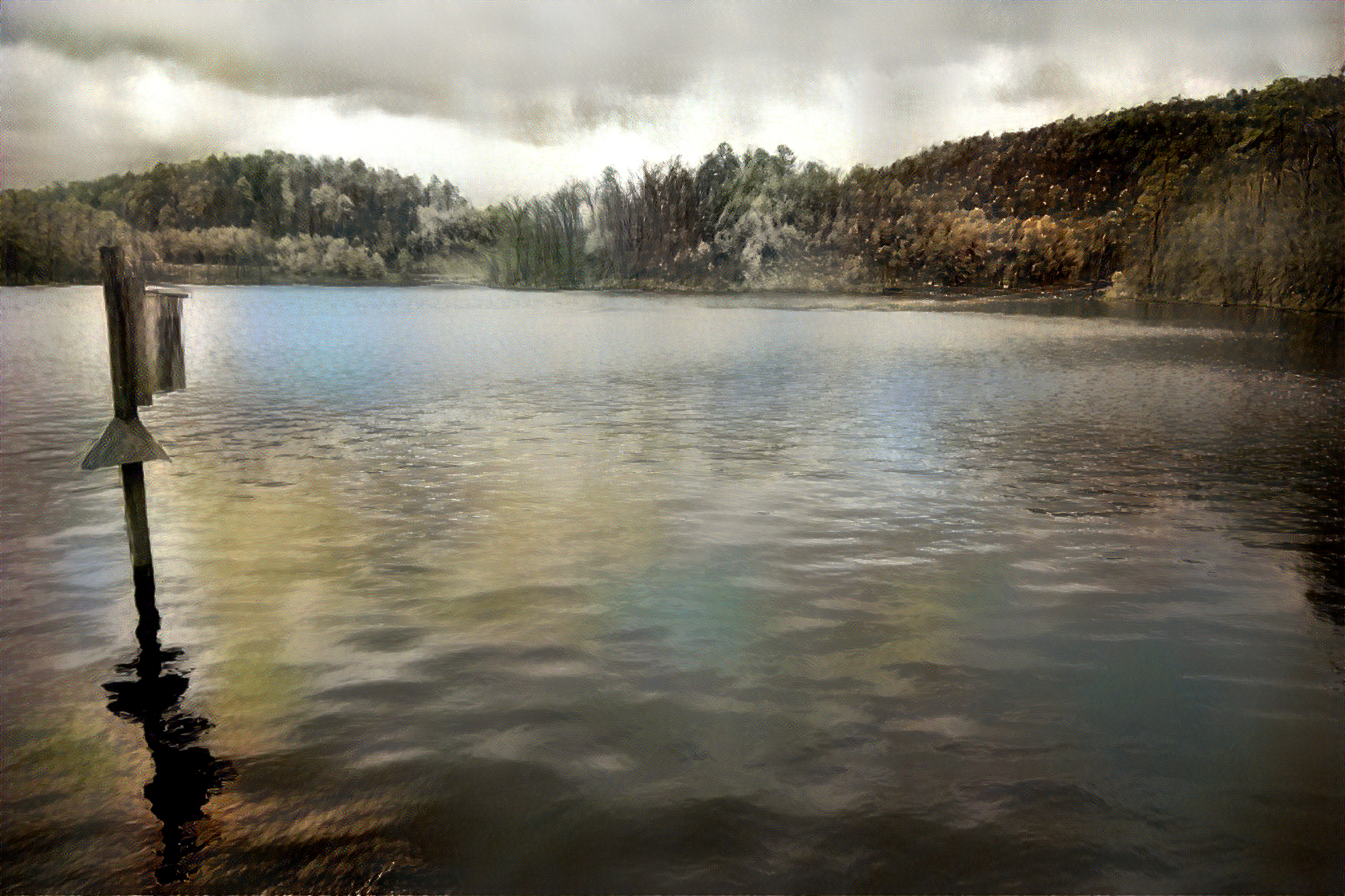 An image of a calm lake with overcast skies at the Rocky Mountain public fishing area in the Northwest tip of Georgia. Coming across a lake I see a duck house on the waters edge. It was an overcast day and it was just me and my friend walking around the lakes. I used my modified Lumix GH3 and used an ultraviolet bandpass filter. It was a cool photo but I knew my style transfer tools could transform it into something like art.