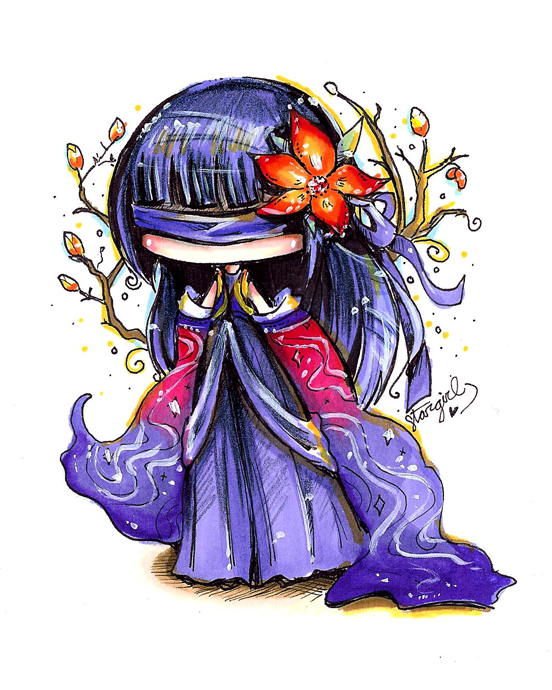 Beautiful and mysterious, the Mystic wanders the astral realm but can sometimes appear in a field of fire lillies. Colored with prismacolor and copic markers, colored pencils, and a white gel pen.